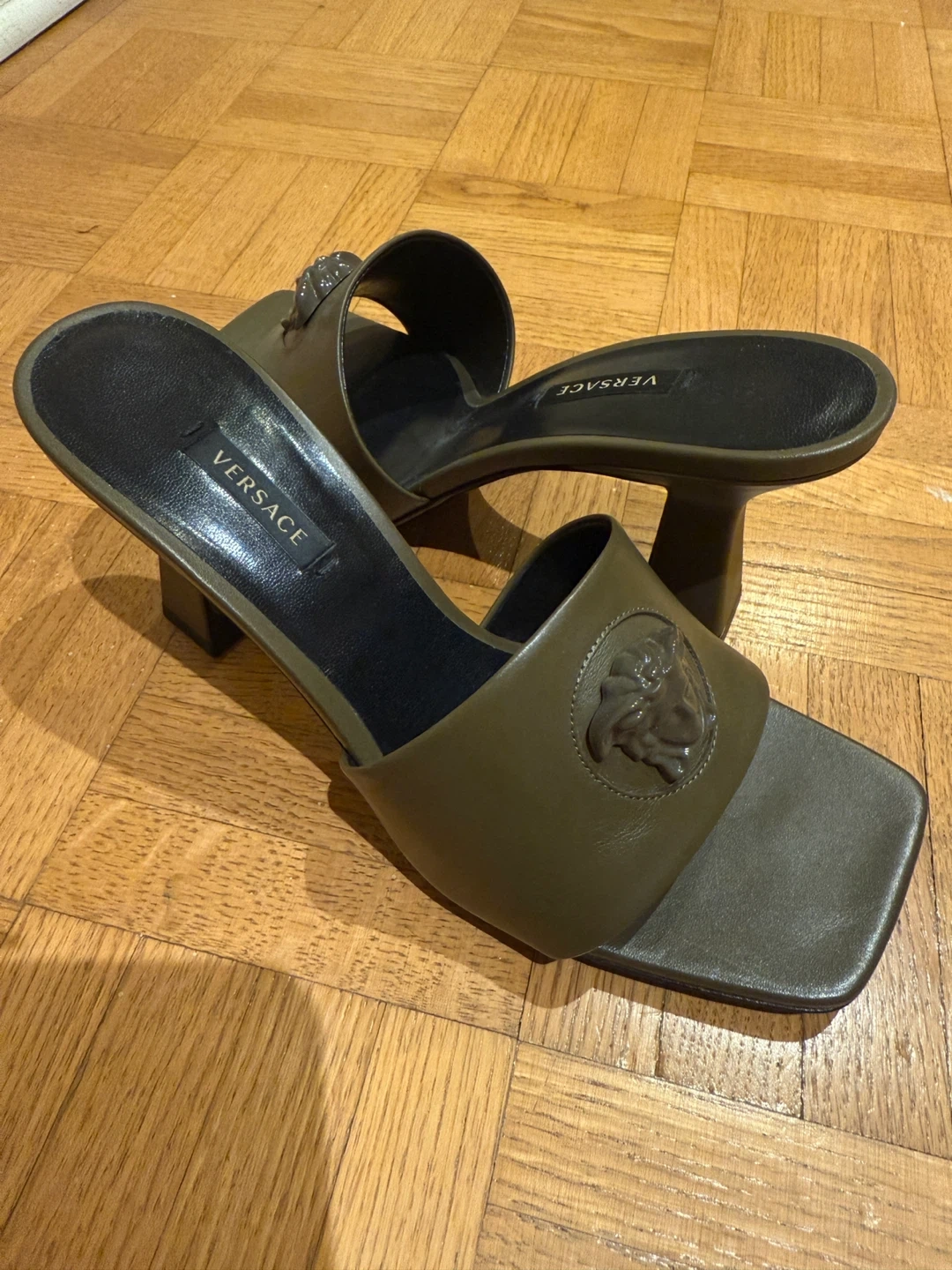 Brand new Versace shoes, original price is $1380 plus tax. These Versace mules are a stylish addition to any wardrobe! They are a size 38 and come in a unique olive green colour. These have the iconic Versace Medusa logo on the front strap and sole. Perfect for adding a touch of luxury to your everyday look