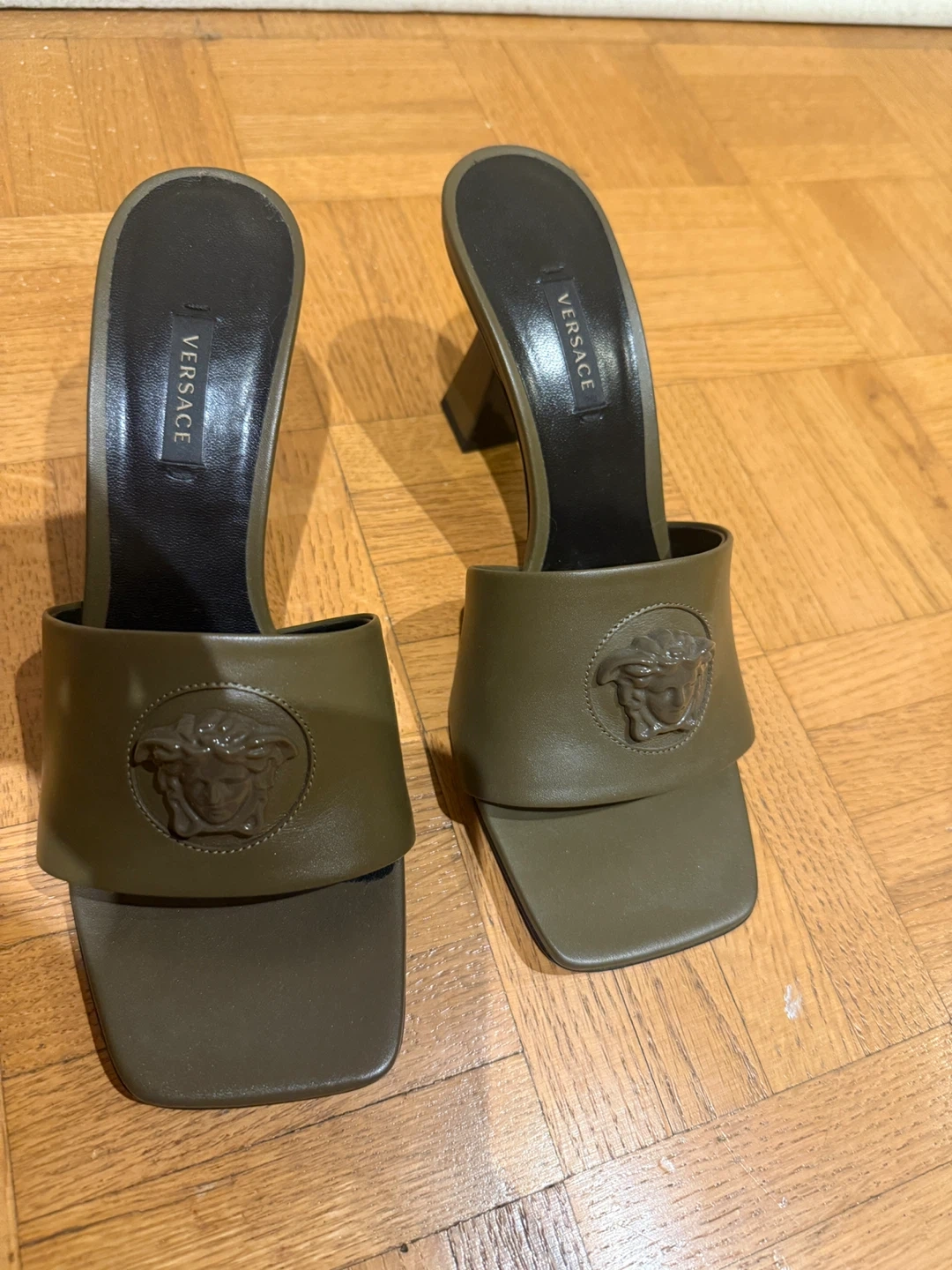 Brand new Versace shoes, original price is $1380 plus tax. These Versace mules are a stylish addition to any wardrobe! They are a size 38 and come in a unique olive green colour. These have the iconic Versace Medusa logo on the front strap and sole. Perfect for adding a touch of luxury to your everyday look