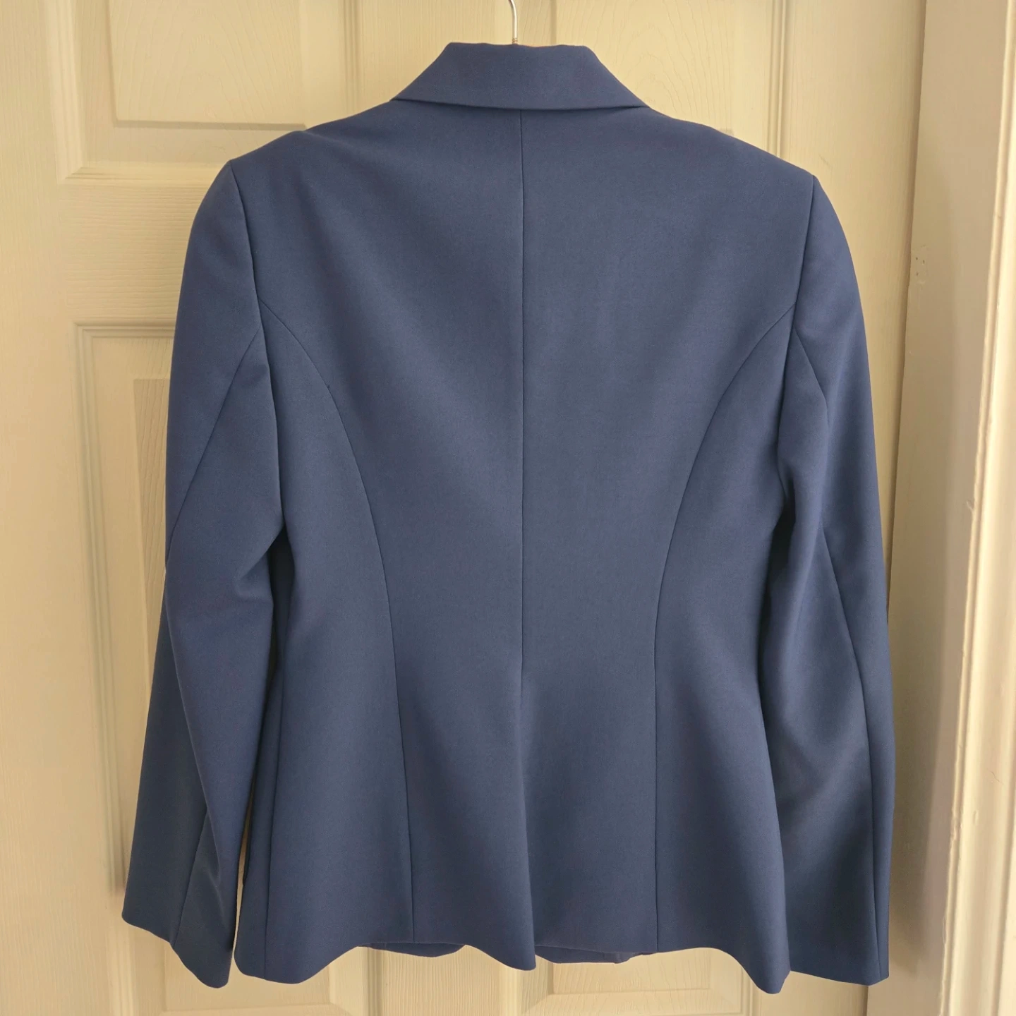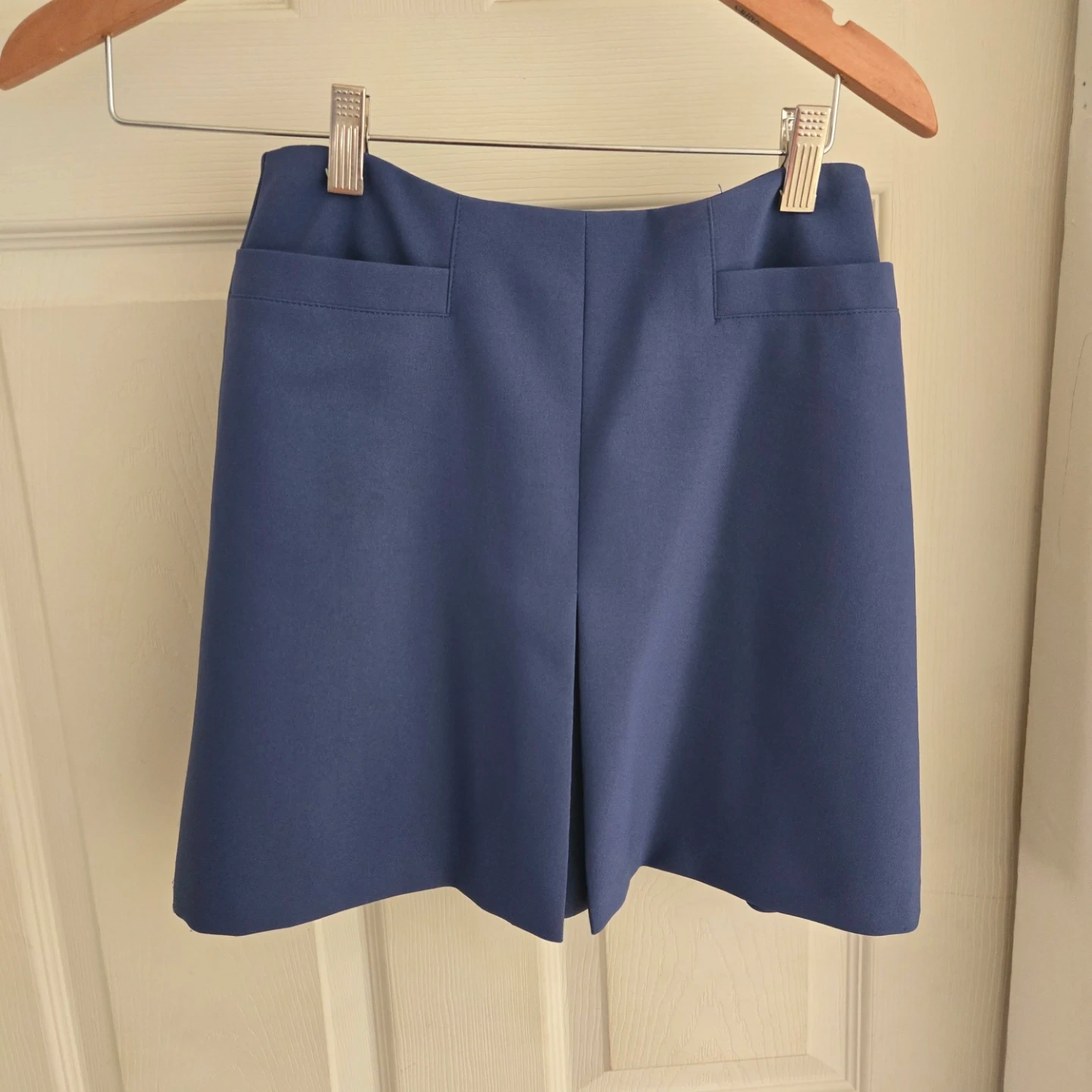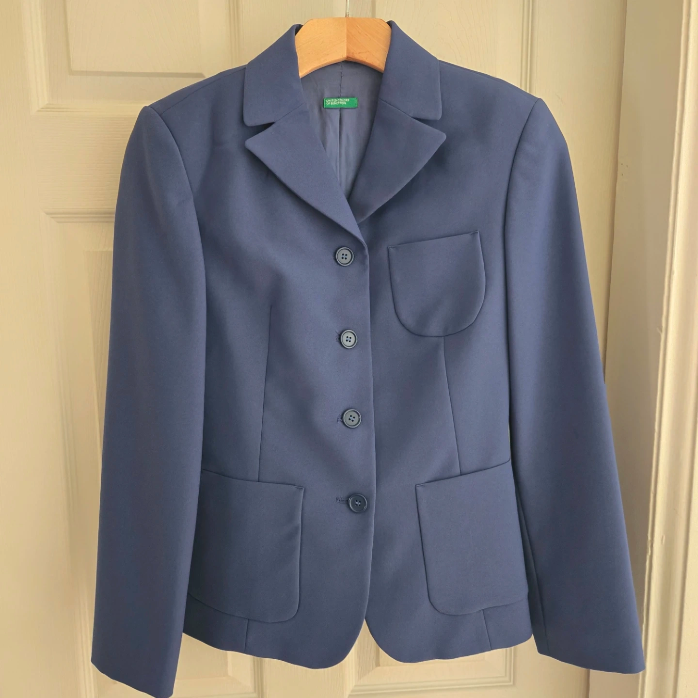 This is a classic blue blazer and skirt set from United Colors of Benetton. It's a lovely navy blue colour. The blazer has a notched lapel and two front pockets. The shorts have a zippered back and two back pockets. Perfect for a smart casual look!