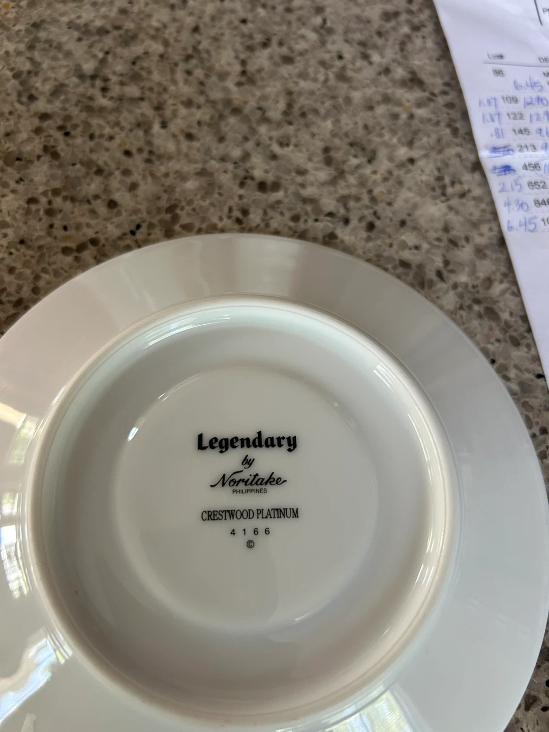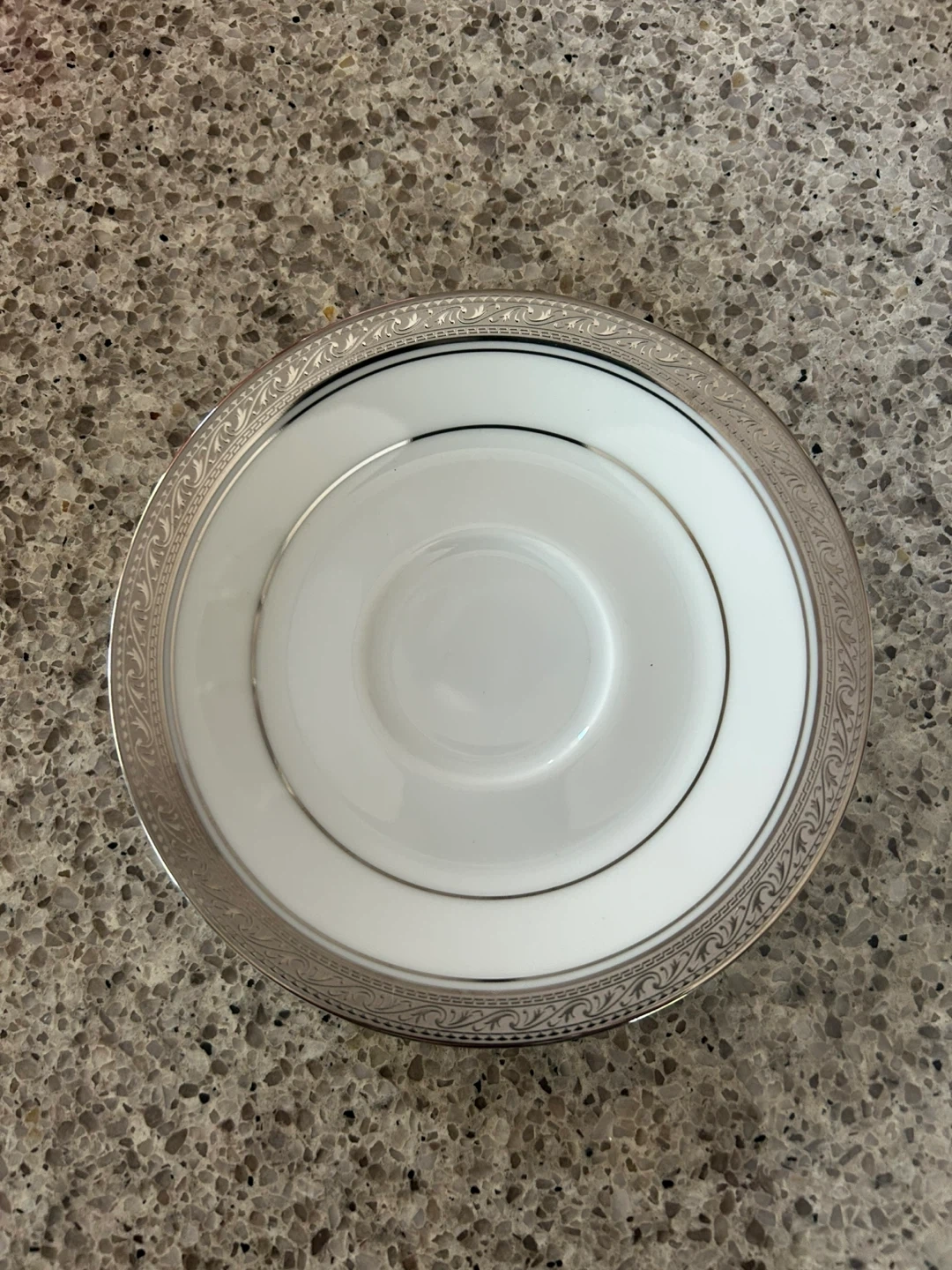 This Noritake tea cup and saucer set features the Crestwood Platinum pattern. It has a classic white porcelain base with elegant platinum trim. Price is for one set and have 10 more sets