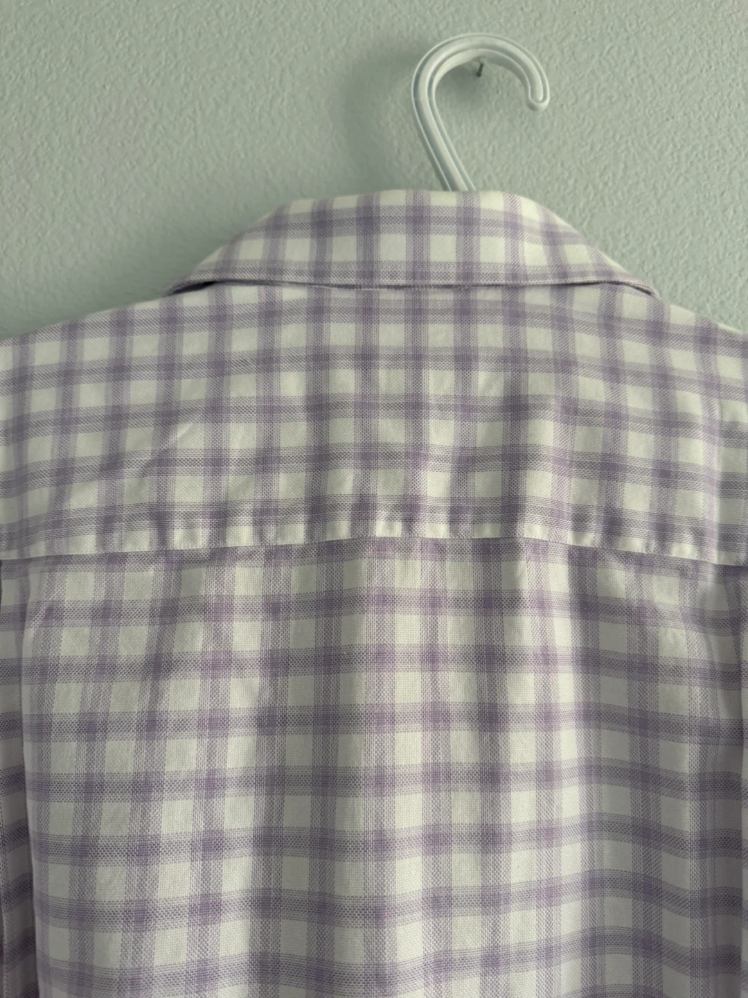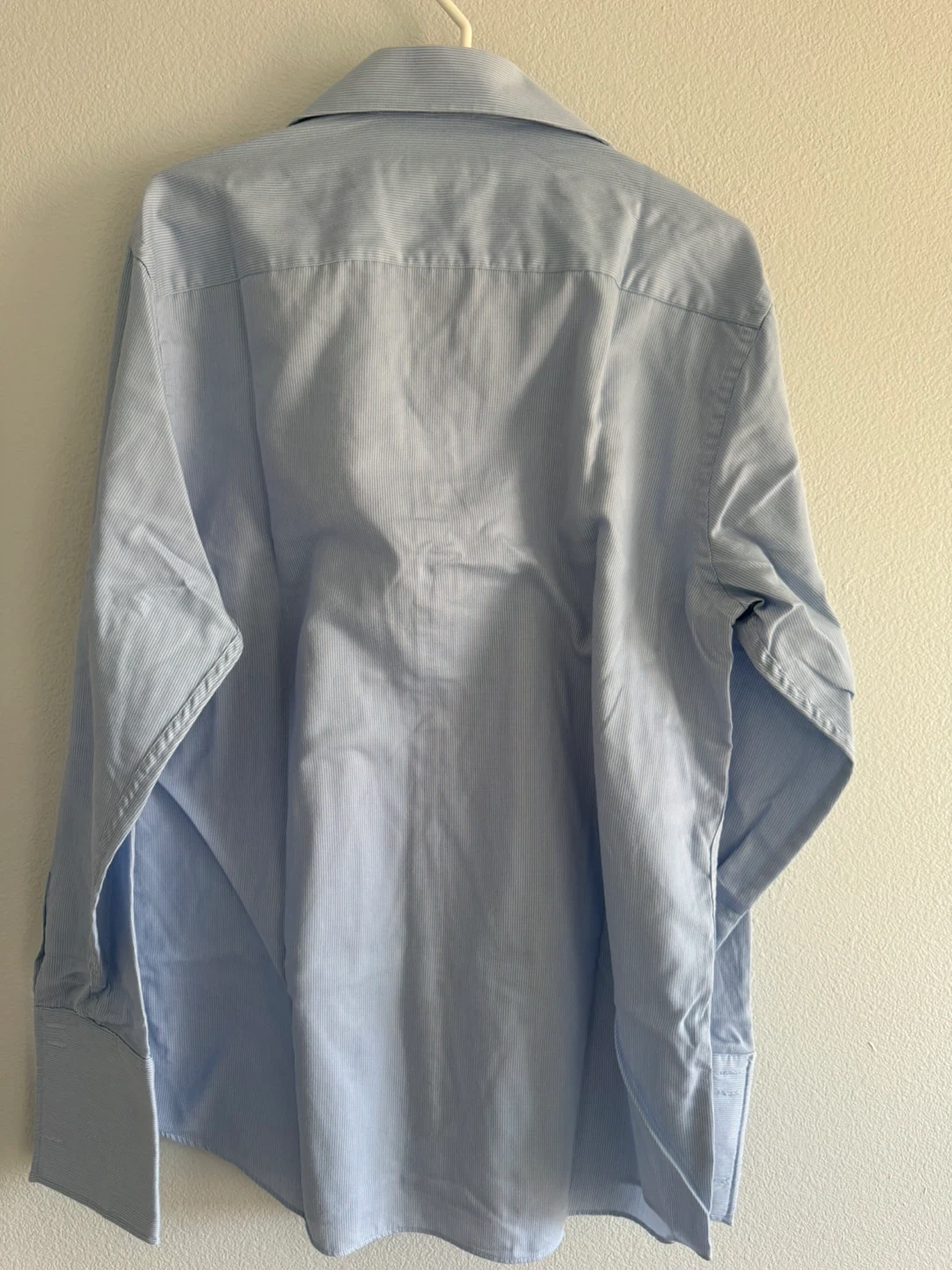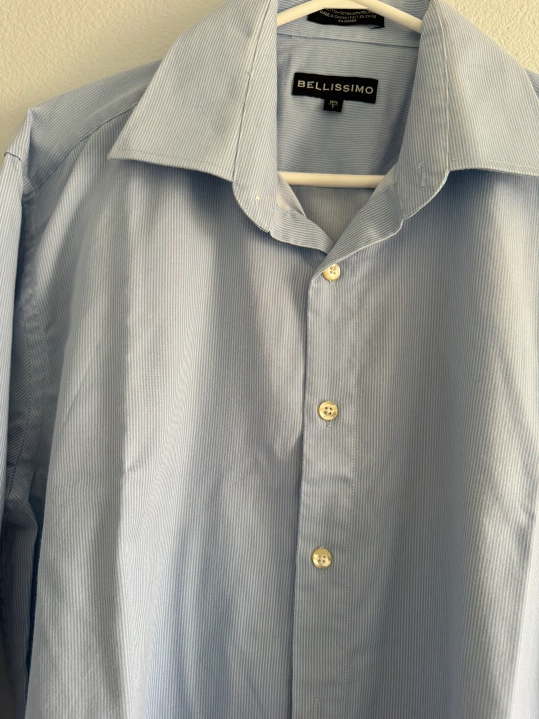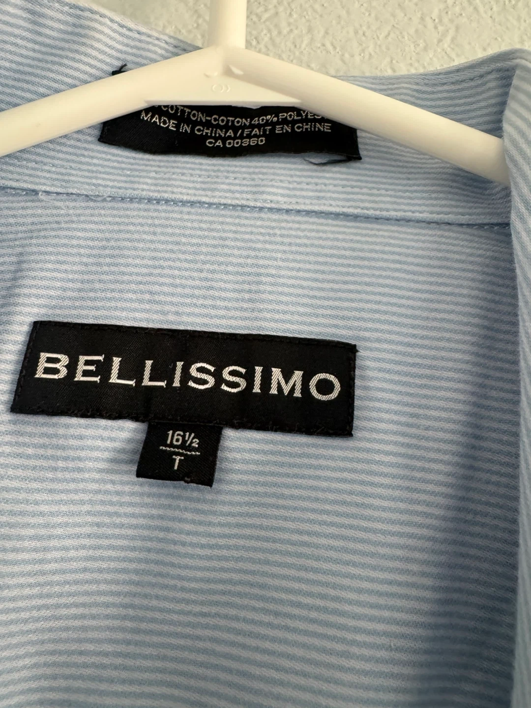Bellissimo men's dress shirt in a light blue pinstripe pattern. It's made of a cotton-polyester blend. This shirt is size 16 1/2 T. Great for a business casual look!