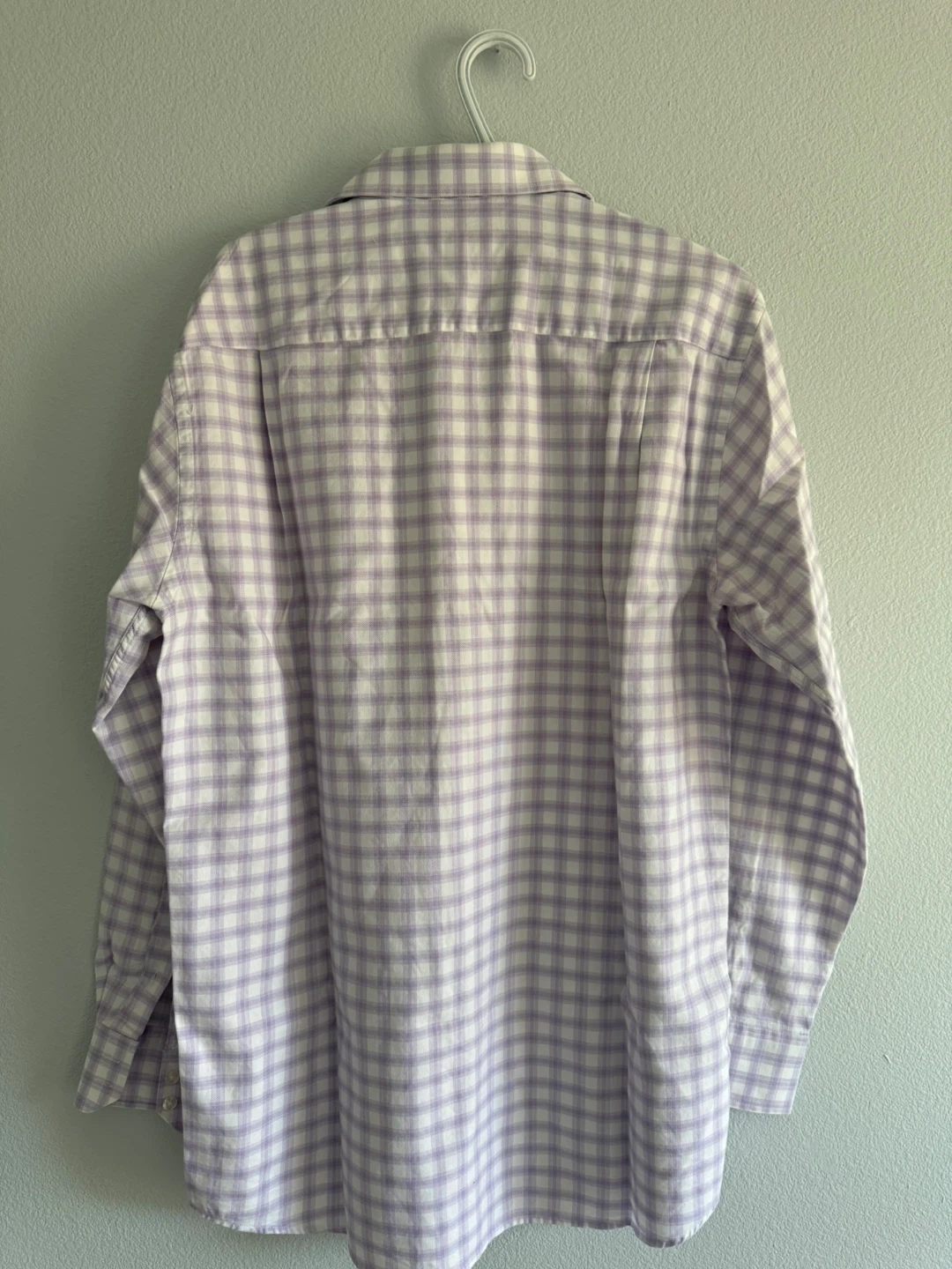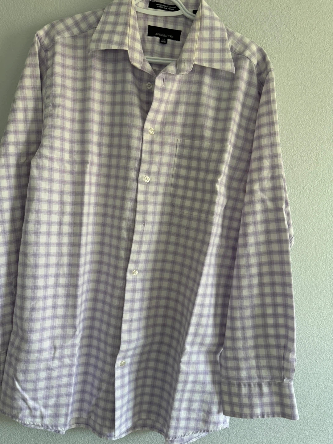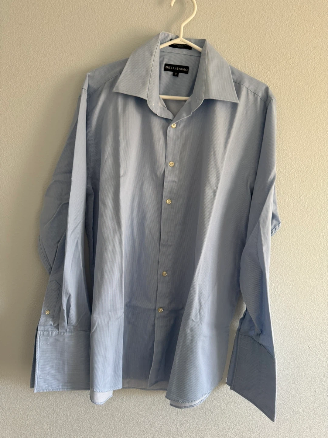 Bellissimo men's dress shirt in a light blue pinstripe pattern. It's made of a cotton-polyester blend. This shirt is size 16 1/2 T. Great for a business casual look!