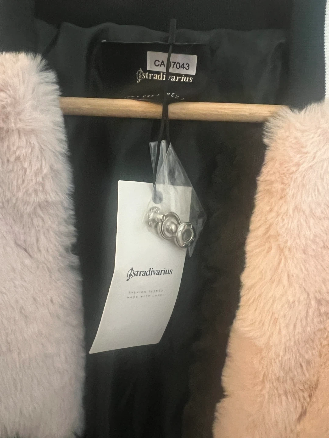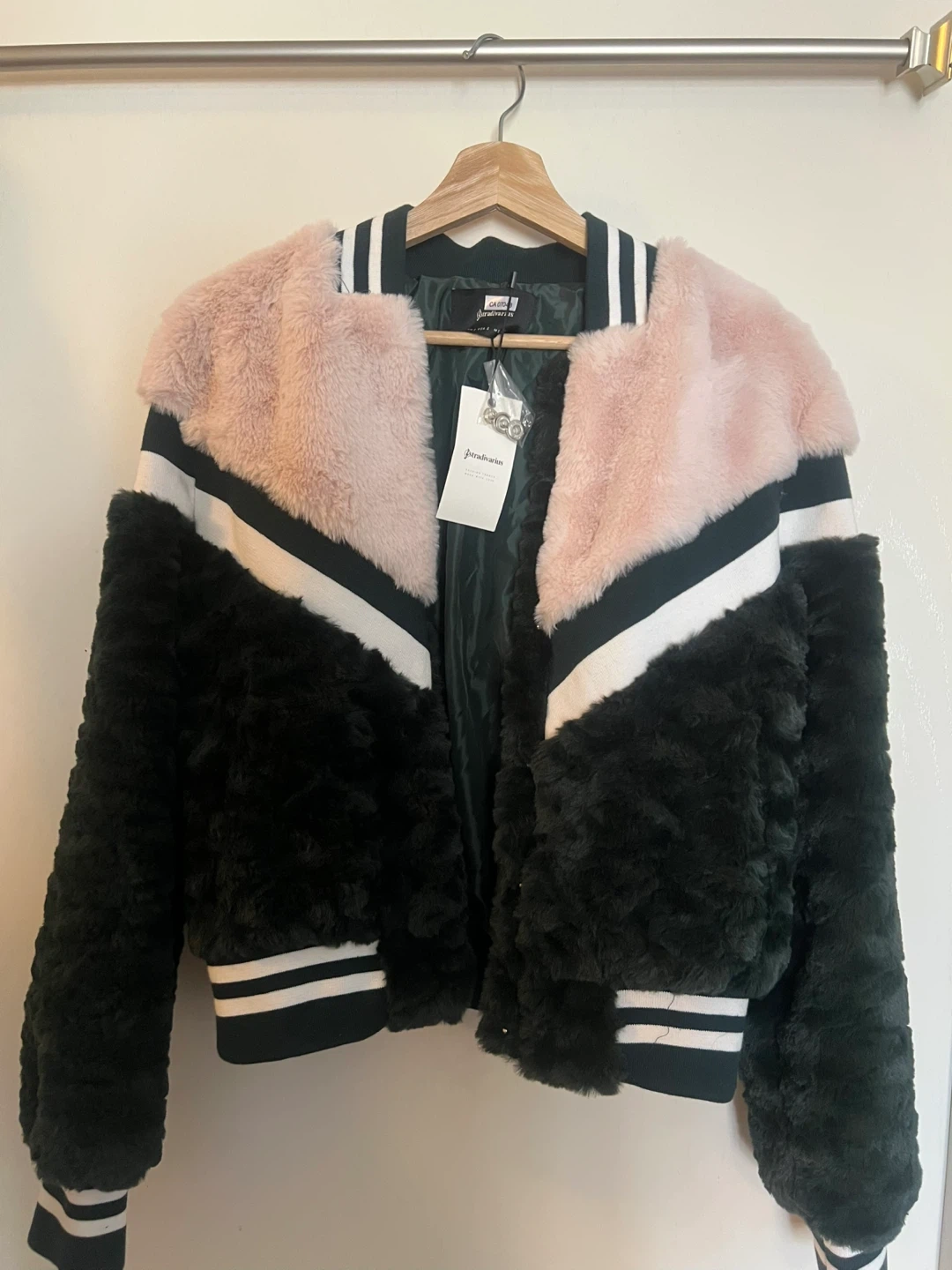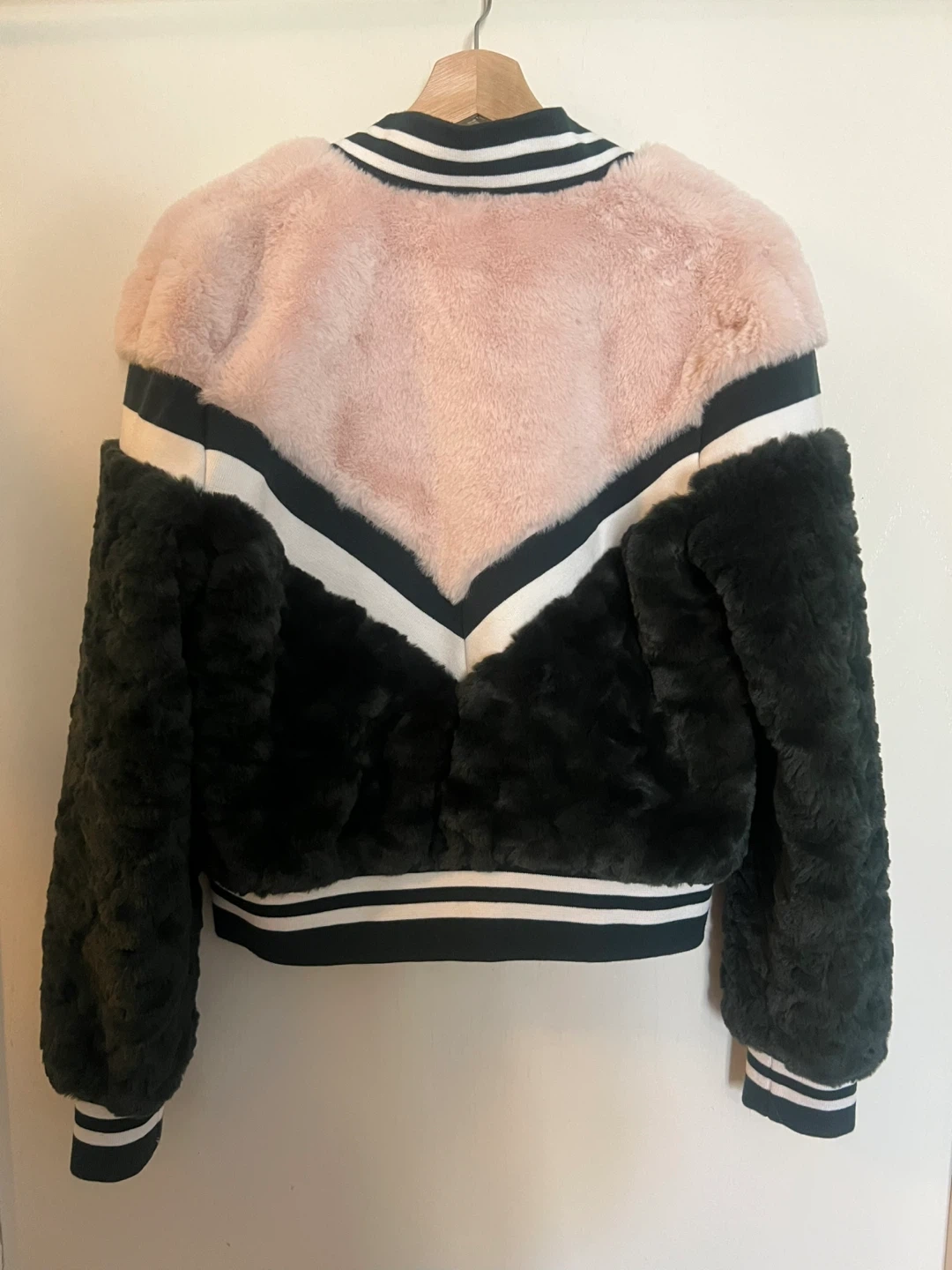 This pink and green faux fur bomber jacket features a chevron design. It's made of 100% polyester. Perfect for adding a stylish touch to your outfit! Super soft! It’s never been worn, the tag is still on.