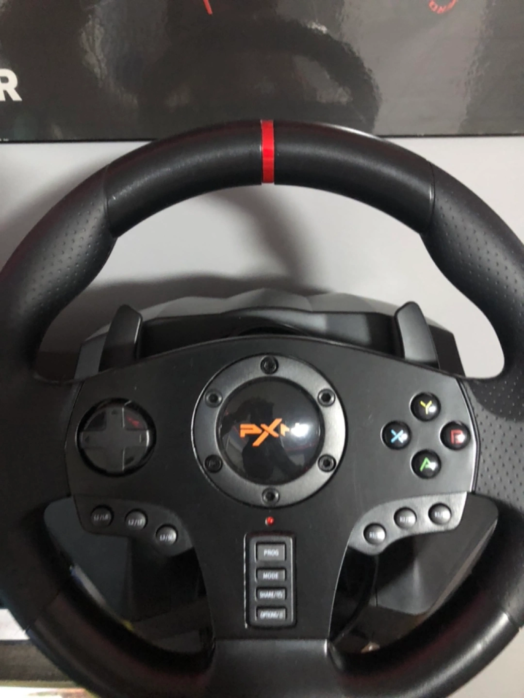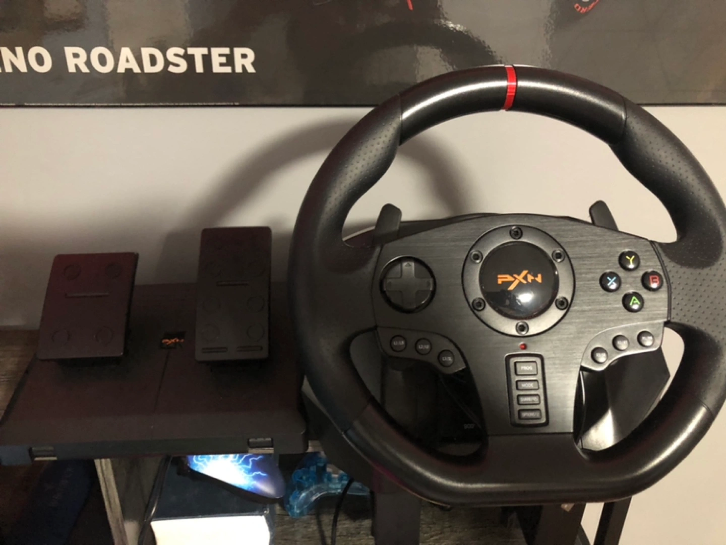 Gaming racing wheel and pedal set. Includes wheel and pedals. Good condition. Suitable for various gaming platforms.