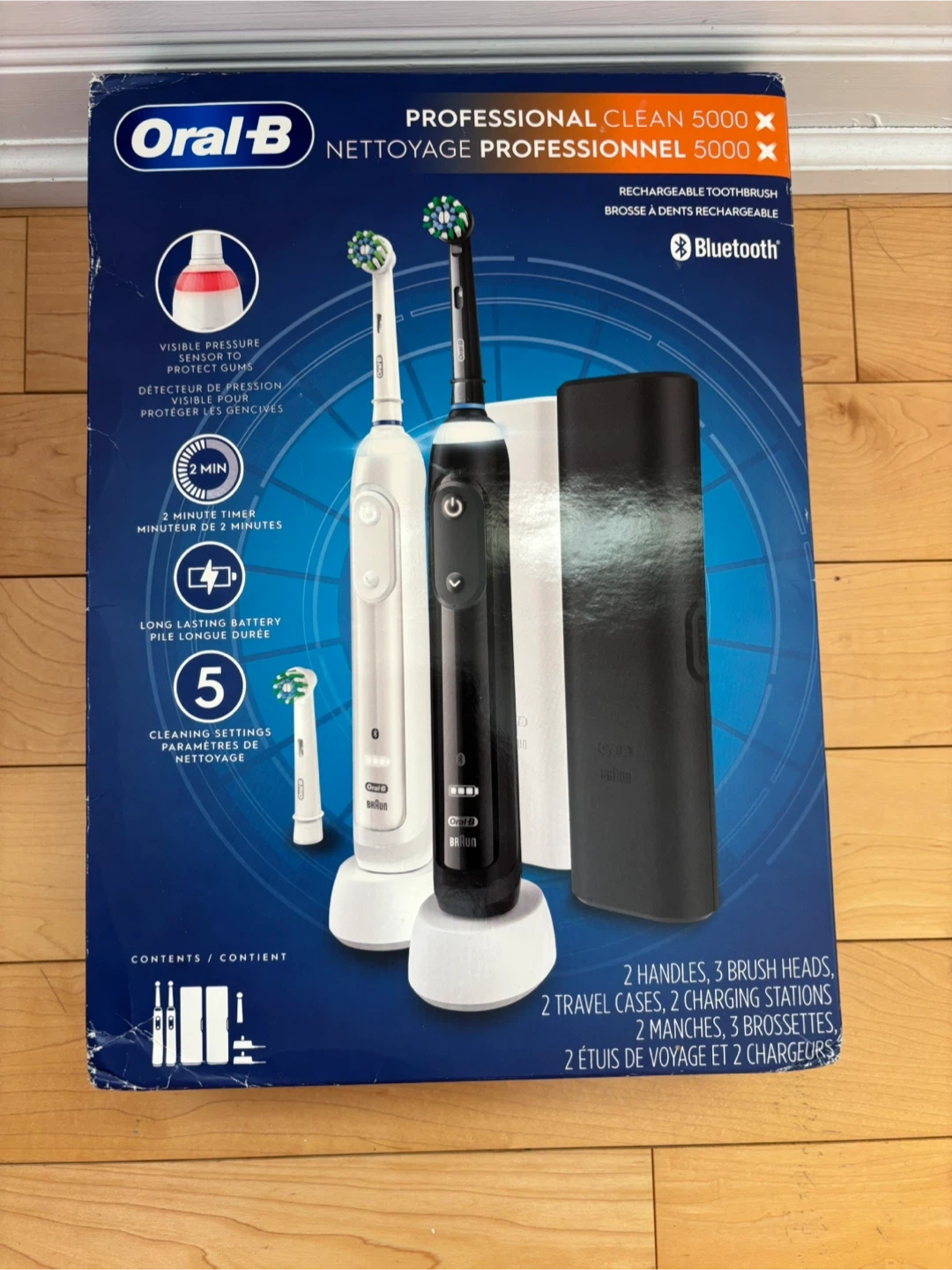 This Oral-B Professional Clean 5000 X rechargeable toothbrush comes with 2 handles and 3 brush heads. It features a visible pressure sensor to protect your gums, a 2-minute timer, long-lasting battery life, and 5 cleaning settings. Also included are 2 travel cases and 2 charging stations. It offers Bluetooth connectivity for a better dental checkup. It is brand new . Box was opened by mistake