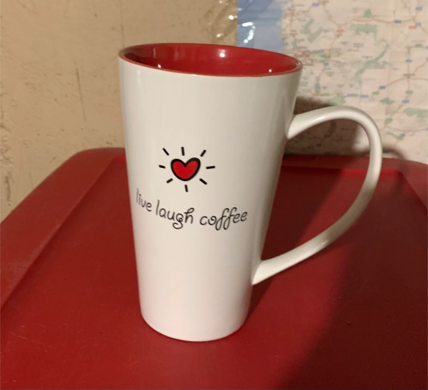 Cute white mug with red interior and "live laugh coffee" design! Perfect for your morning brew or a cozy afternoon pick-me-up