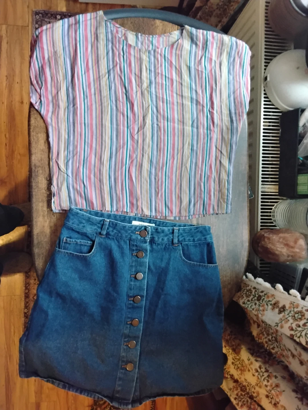 This set includes a twikDENIM jean skirt and a colourful striped blouse. The skirt features a button-front closure and pockets. The blouse has short sleeves and a relaxed fit. Skirt is medium and top is not sized but fit is m/s Take both for $7 or one for $4
