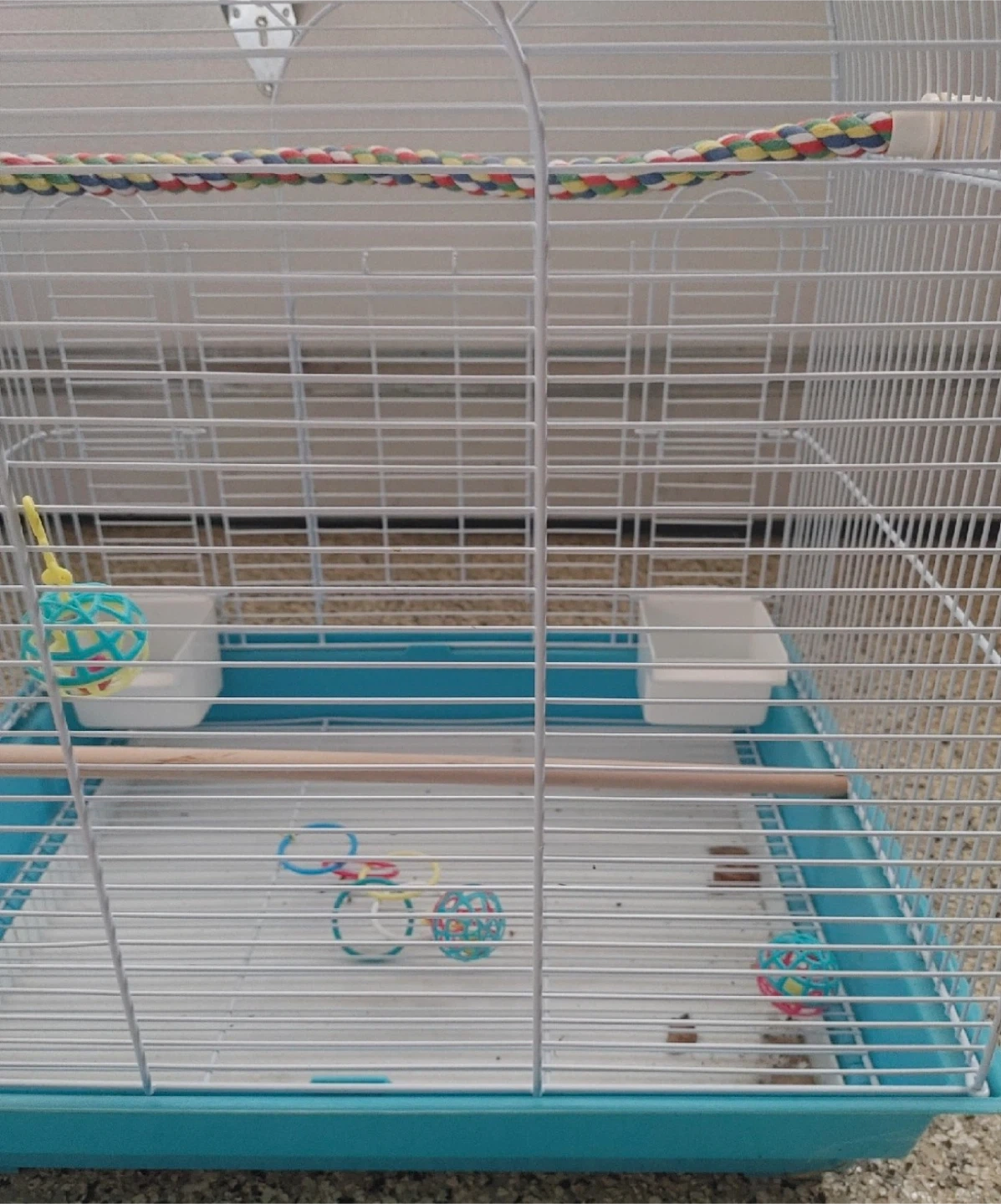 This bird cage is white with a blue base. It includes wooden perches and feeding cups. The cage has a curved top and a swing accessory.