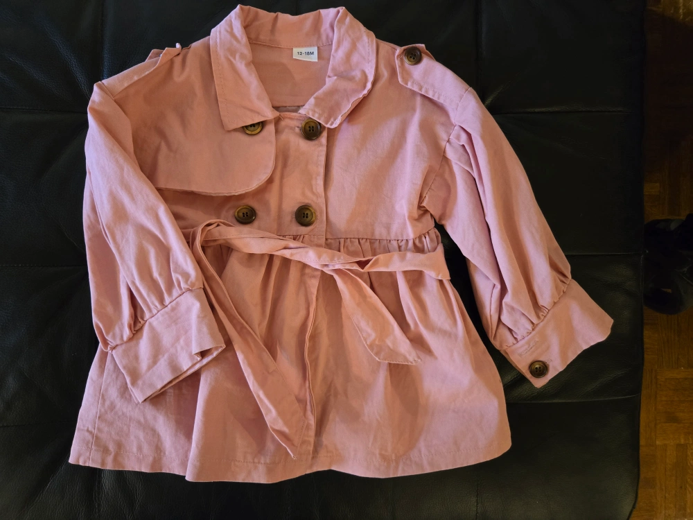 Adorable pink baby girl trench coat. Size 12-18 months. Features a belted waist, collared neckline, and wooden buttons. Long sleeves and a slightly A-line shape.