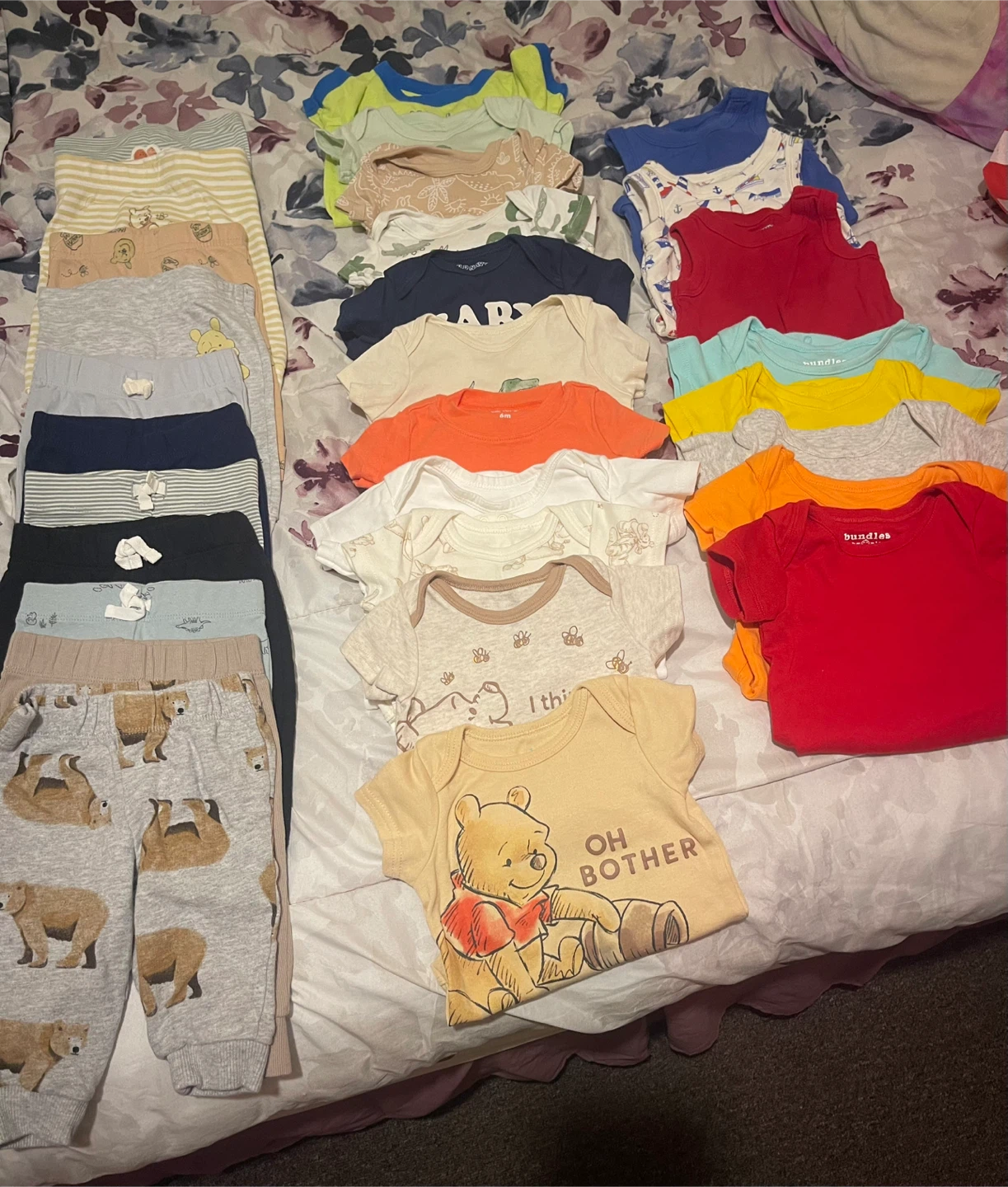 This bundle includes 30 pieces a variety of baby bodysuits and pants. bodysuits feature character designs like Winnie the Pooh and bear prints. Some pants also have bear patterns. Clothing Is 3-6