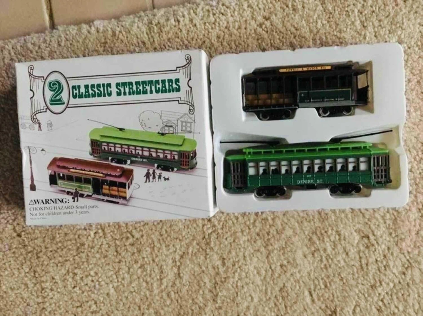 Vintage: This BRAND NEW set includes two classic streetcar models, one green and one with a maroon roof. The green streetcar is labelled 'DESIRE ST.'. They're presented in a display box.