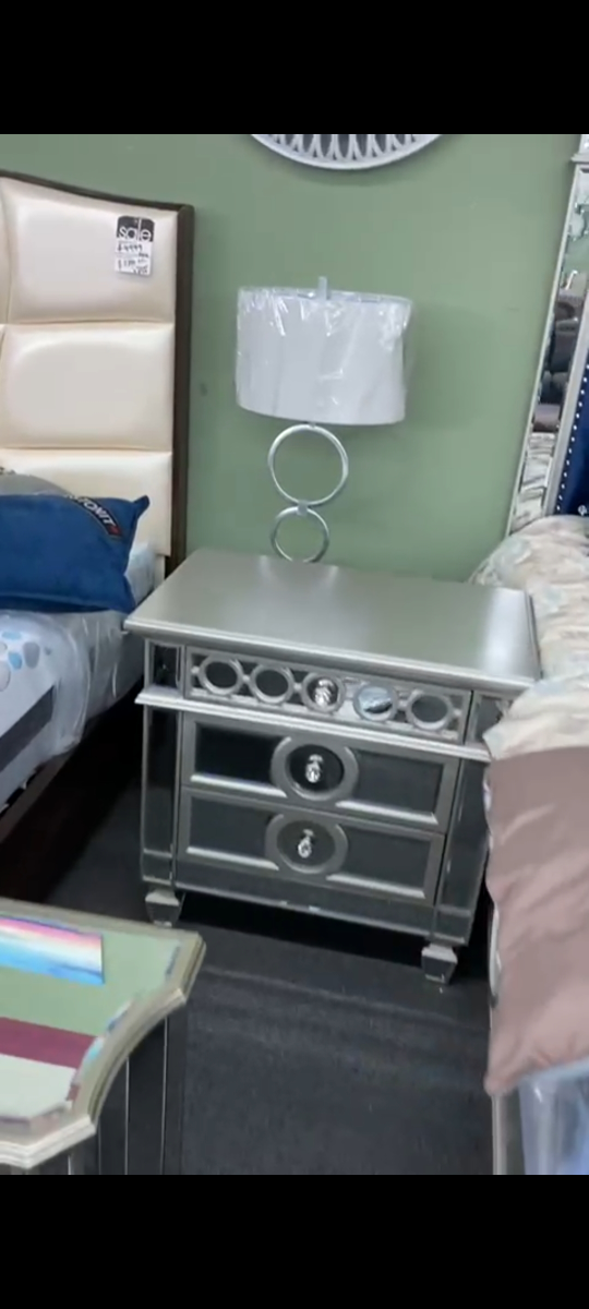 Selling a silver mirrored nightstand. It has a very unique design with mirrored accents and silver finish. It would look great in any bedroom!