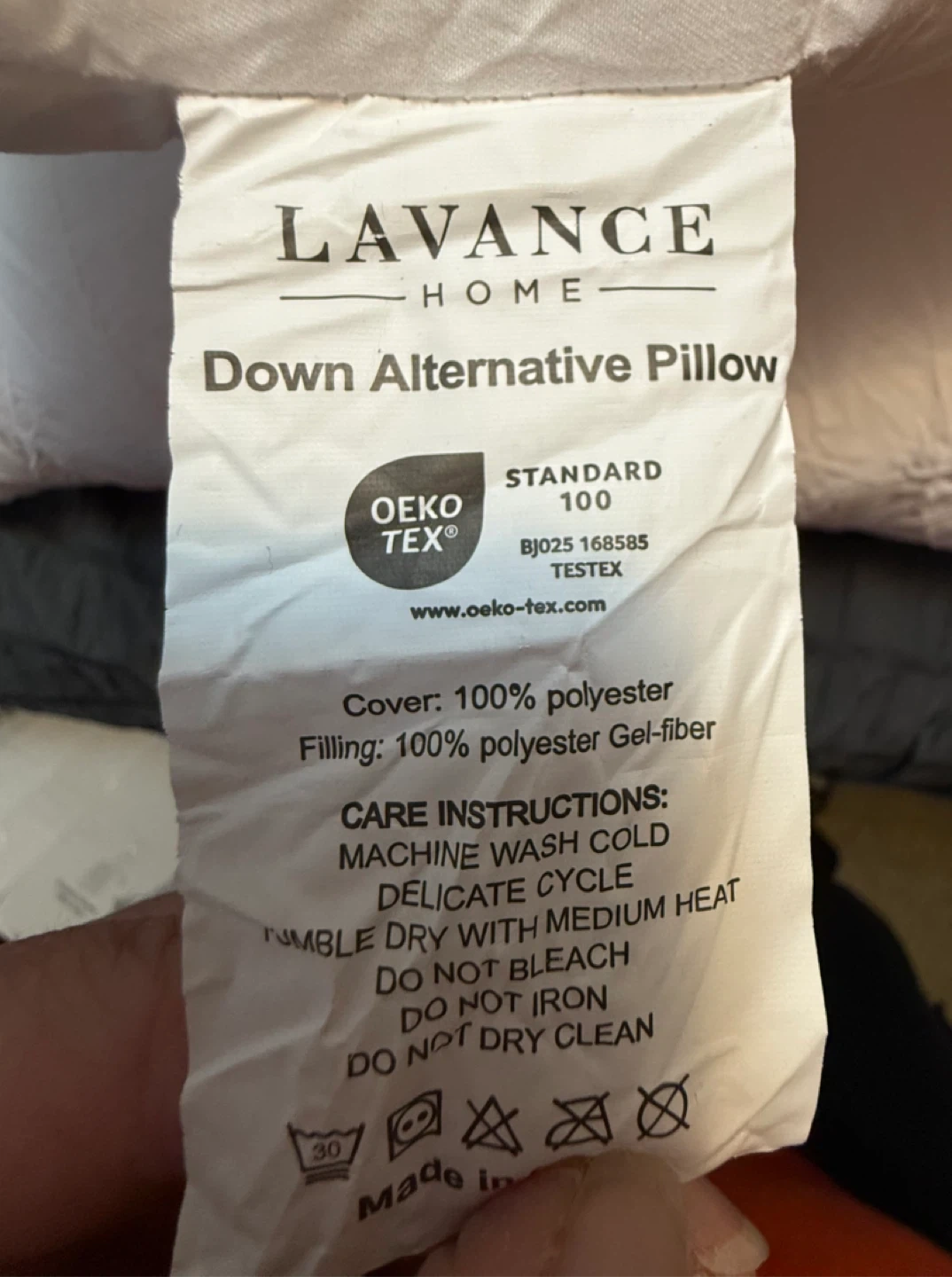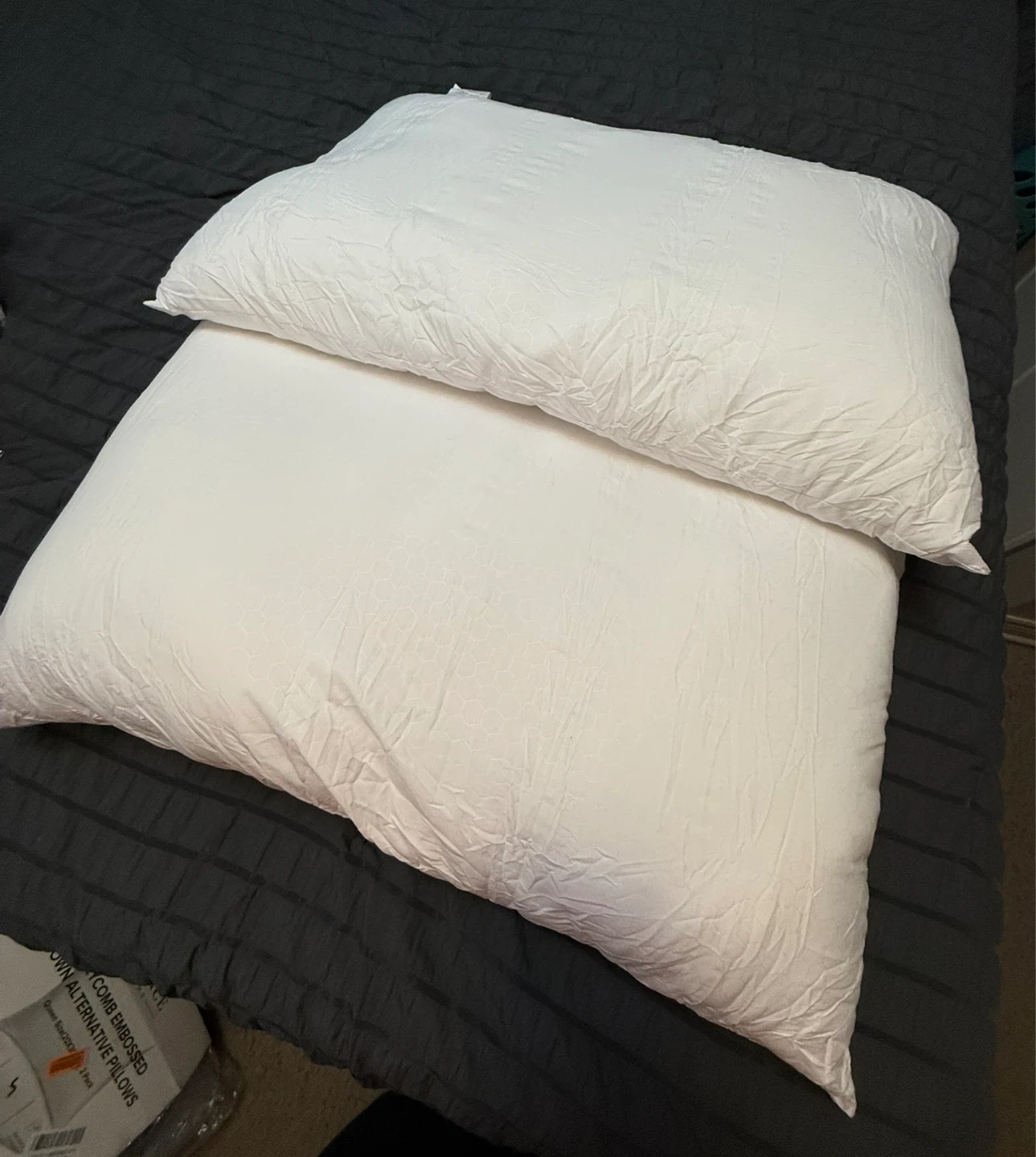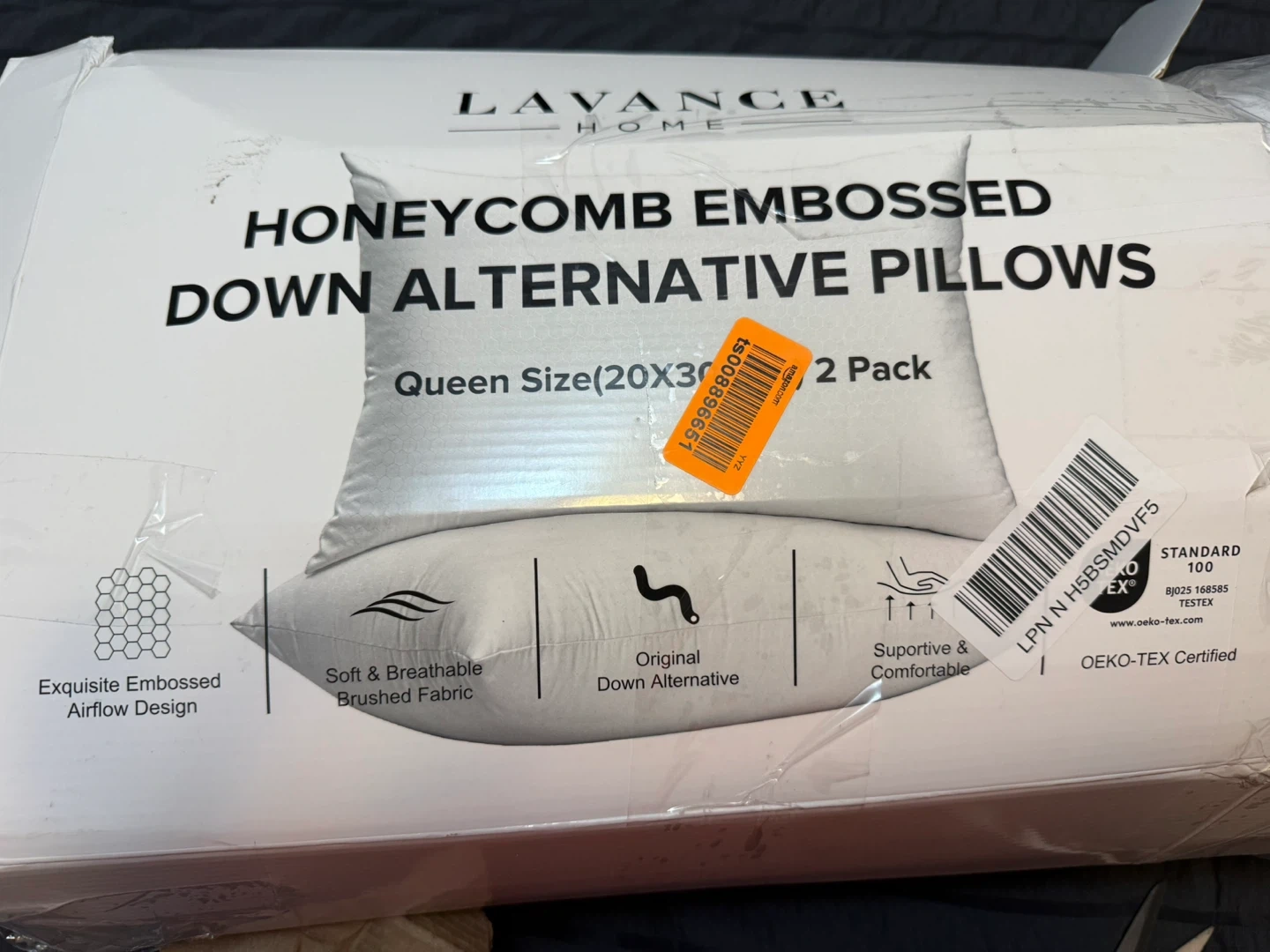 These are Lavance Home honeycomb embossed down alternative pillows. They're a queen size and come as a 2 pack. Cover is 100% polyester with a 100% polyester gel-fiber filling.