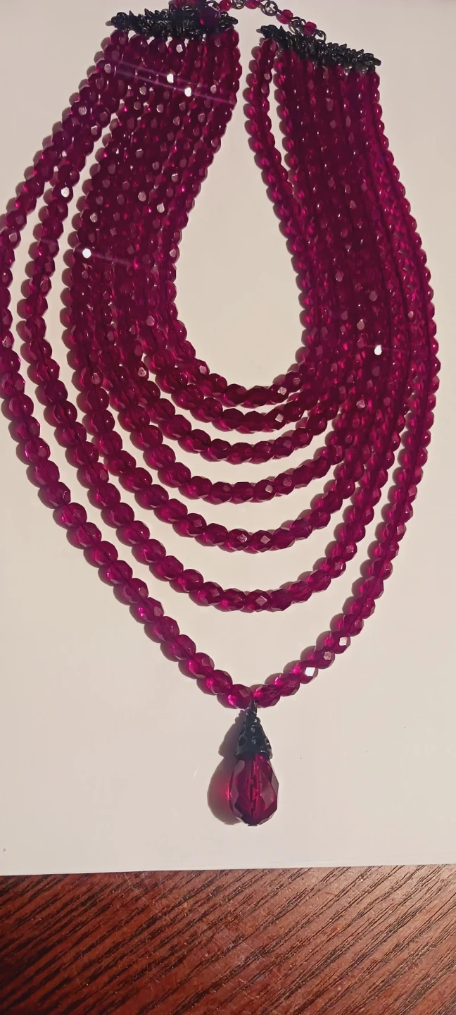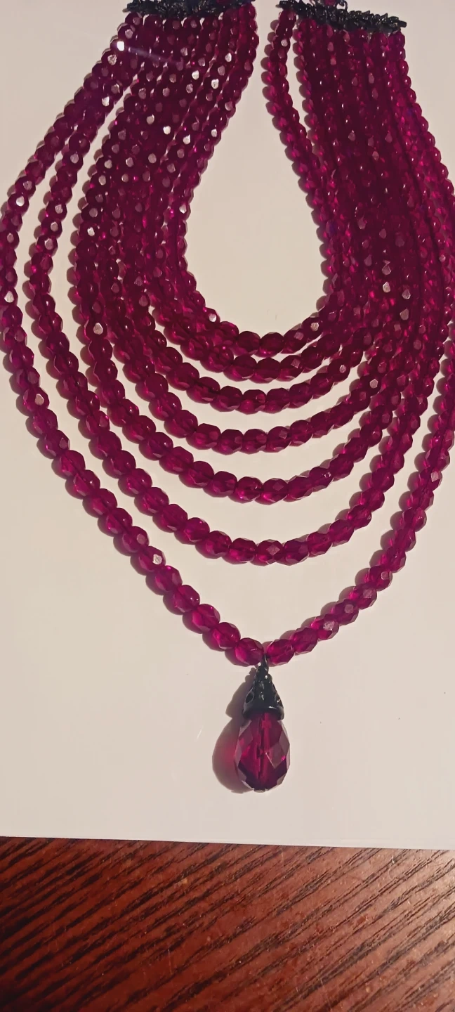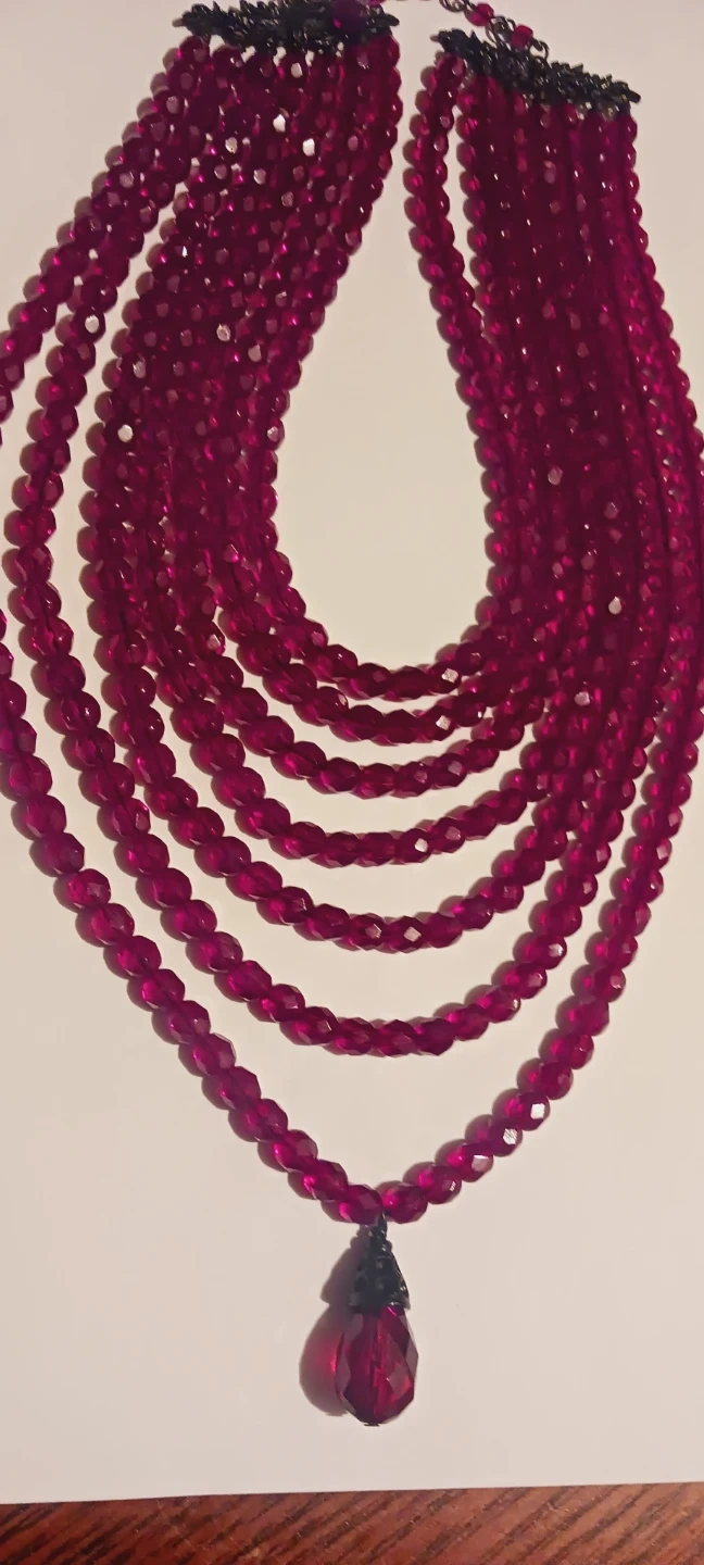 This is a gorgeous vintage unique multi-strand necklace featuring numerous faceted ruby beads. It includes a larger, teardrop-shaped pendant at the center. The necklace has a dark-toned clasp and a layered design. 20" long. Excellent condition. ALL MY PRICES ARE NEGOTIABLE !!