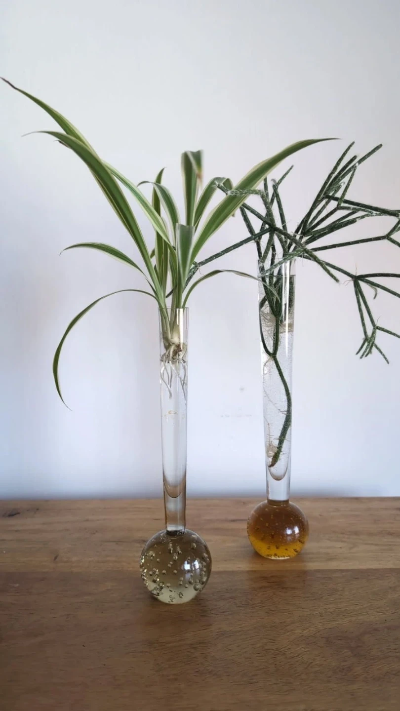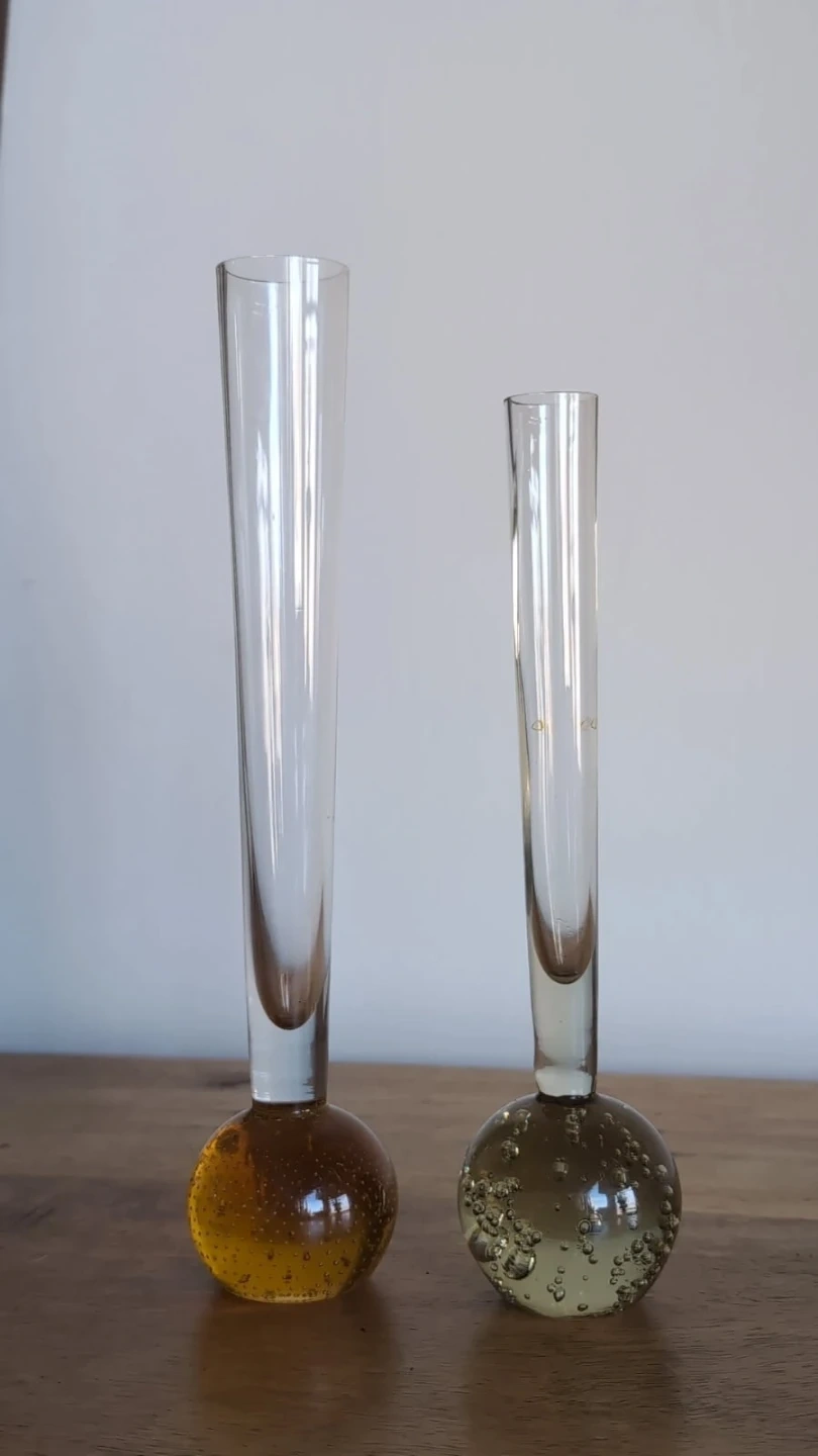 Mid Century Hand Blown Controlled Bubble Single Stem Vases.
