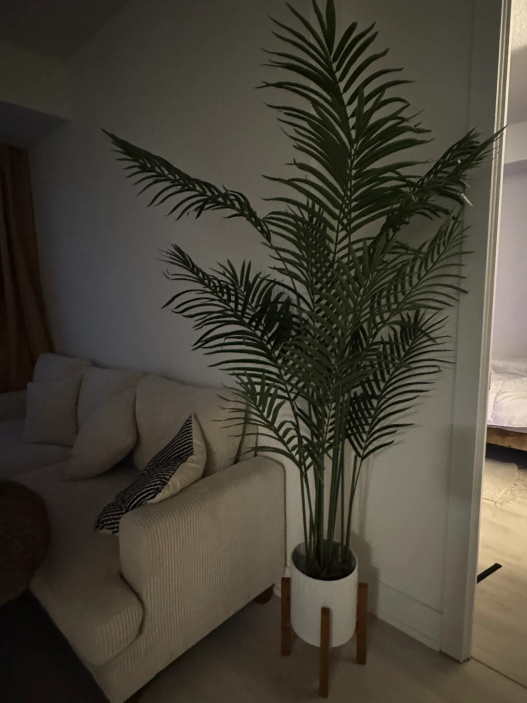 Two tall artificial Areca palm plant. And two small monstera plants It has realistic green fronds and comes in a white pot with a wooden stand. This plant adds a touch of greenery to any room.