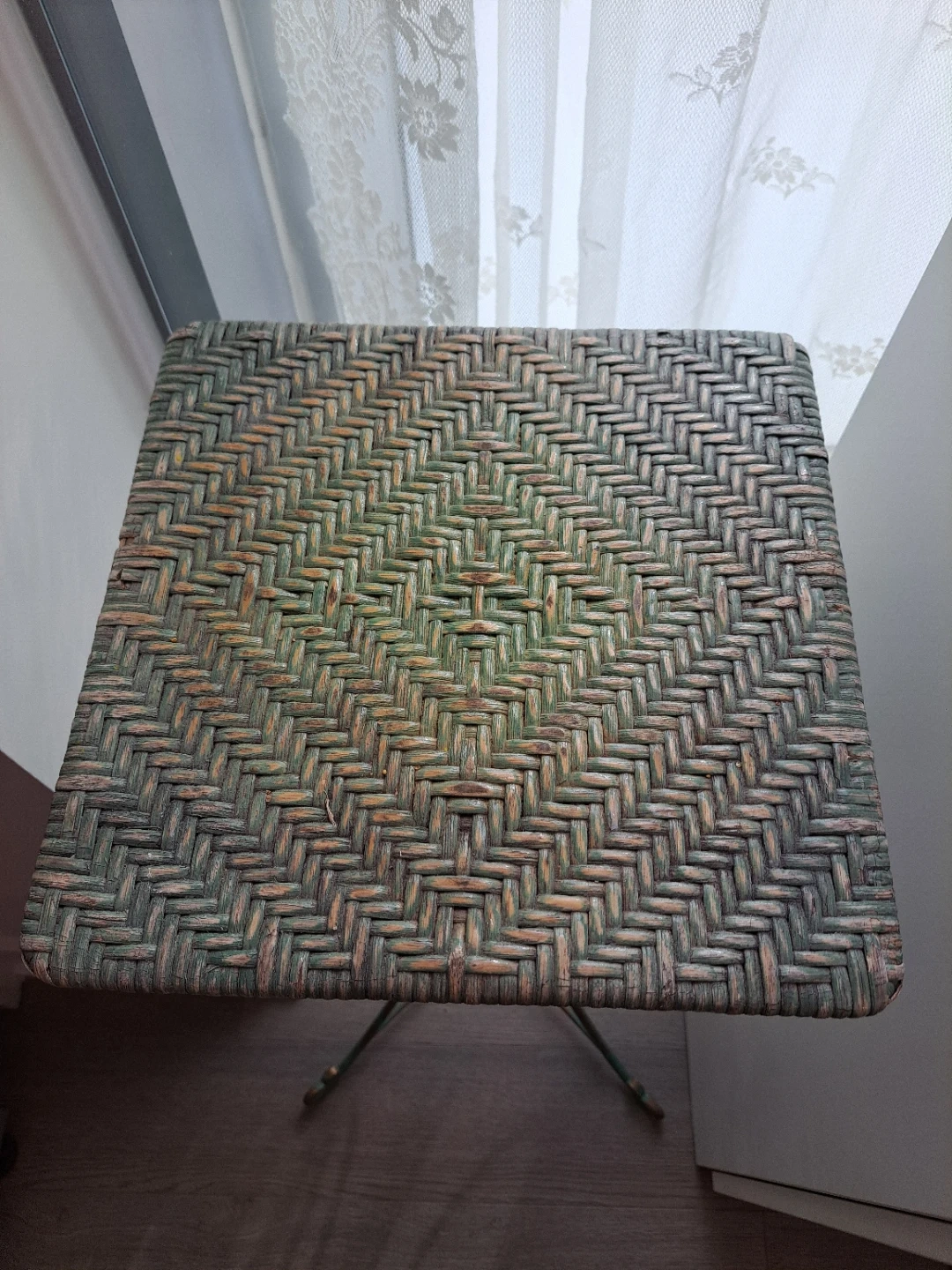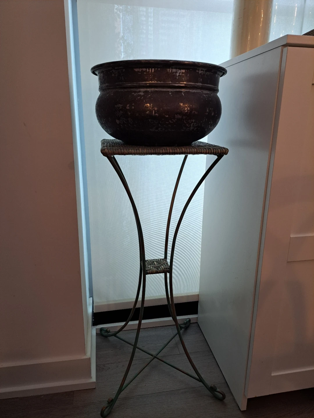 A vintage hammered metal pot sits on a decorative stand with a wicker top. This piece adds a rustic charm to any indoor or outdoor space. It's great for holding plants or as a decorative accent.