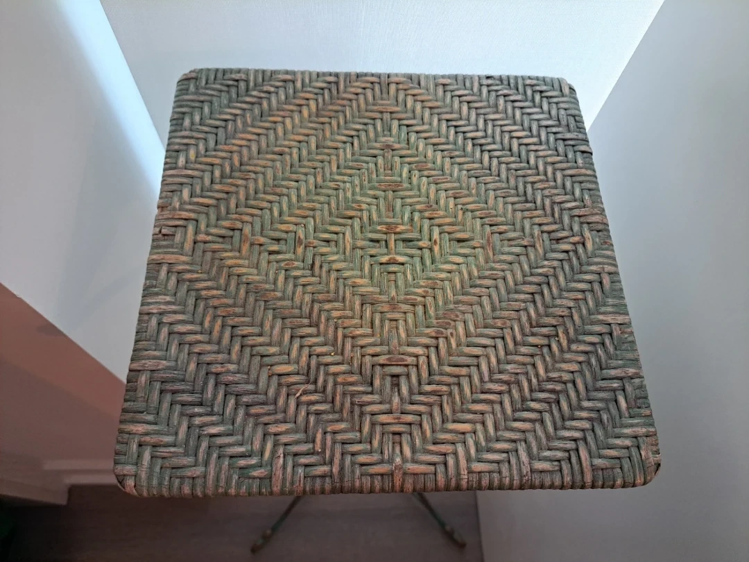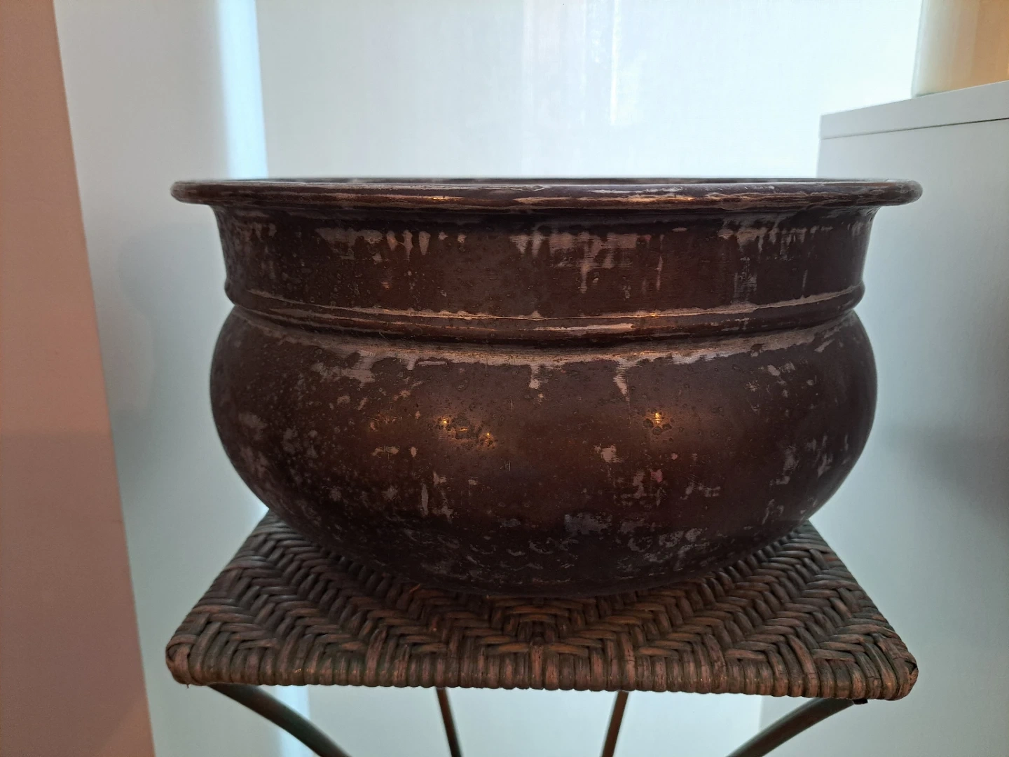 A vintage hammered metal pot sits on a decorative stand with a wicker top. This piece adds a rustic charm to any indoor or outdoor space. It's great for holding plants or as a decorative accent.