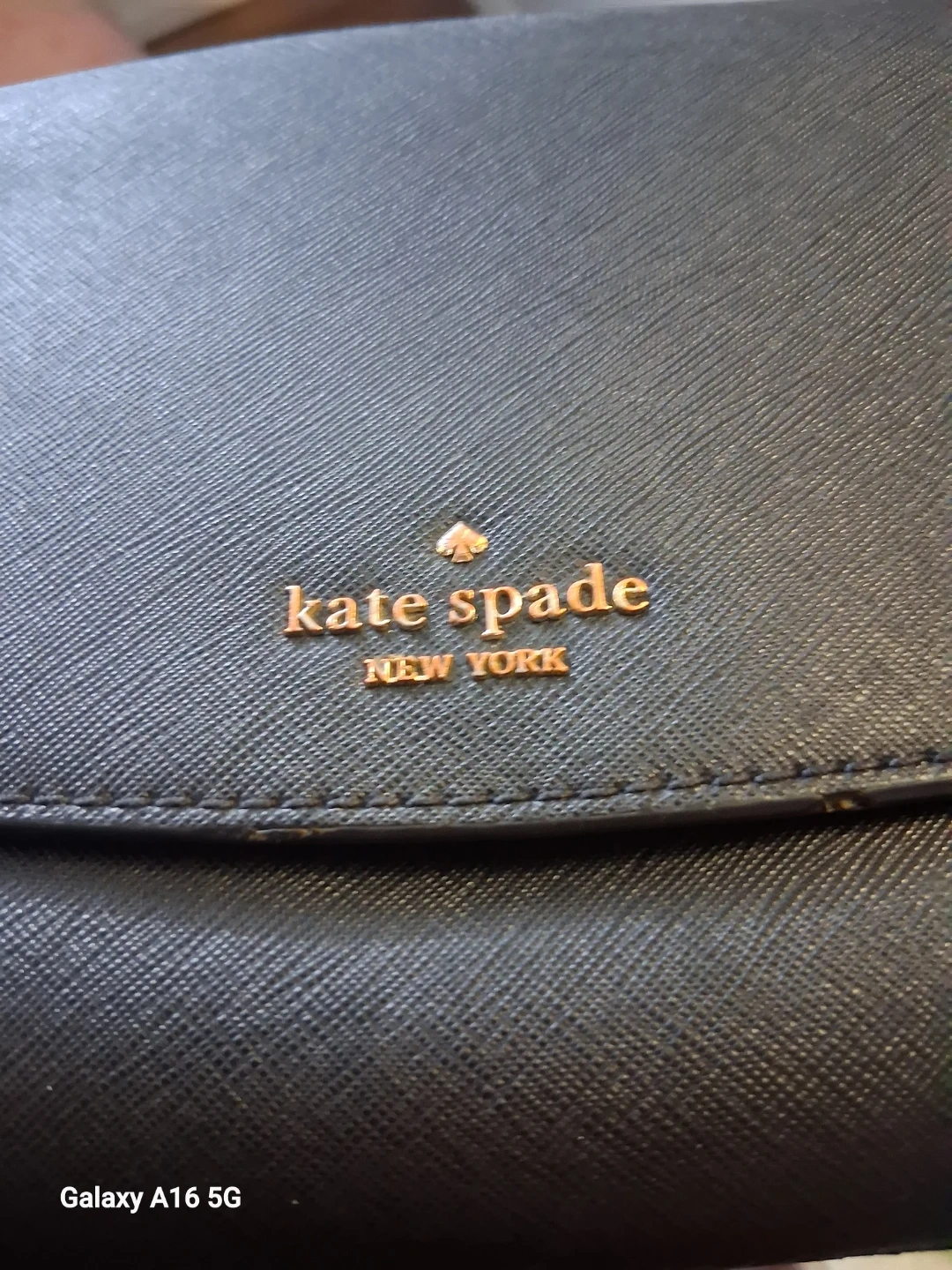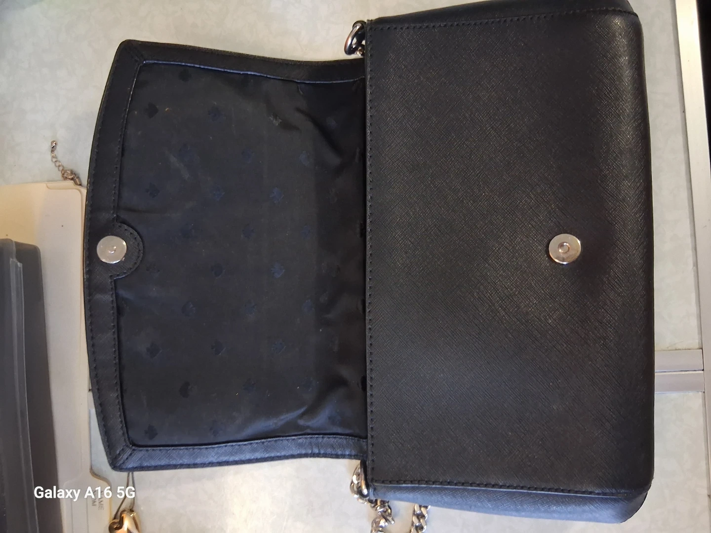 This is a black Kate Spade shoulder bag. It's made of saffiano leather. The interior has a floral print lining. It comes with a silver- chain strap. Used but in great condition.