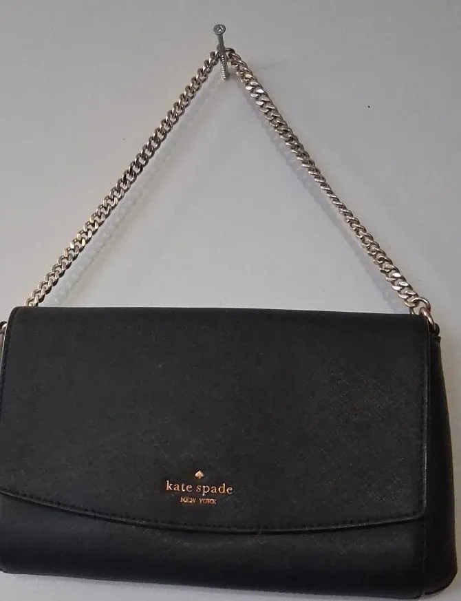 This is a black Kate Spade shoulder bag. It's made of saffiano leather. The interior has a floral print lining. It comes with a silver- chain strap. Used but in great condition.