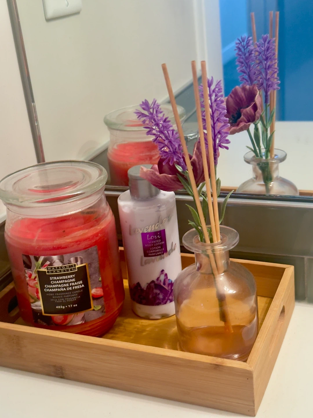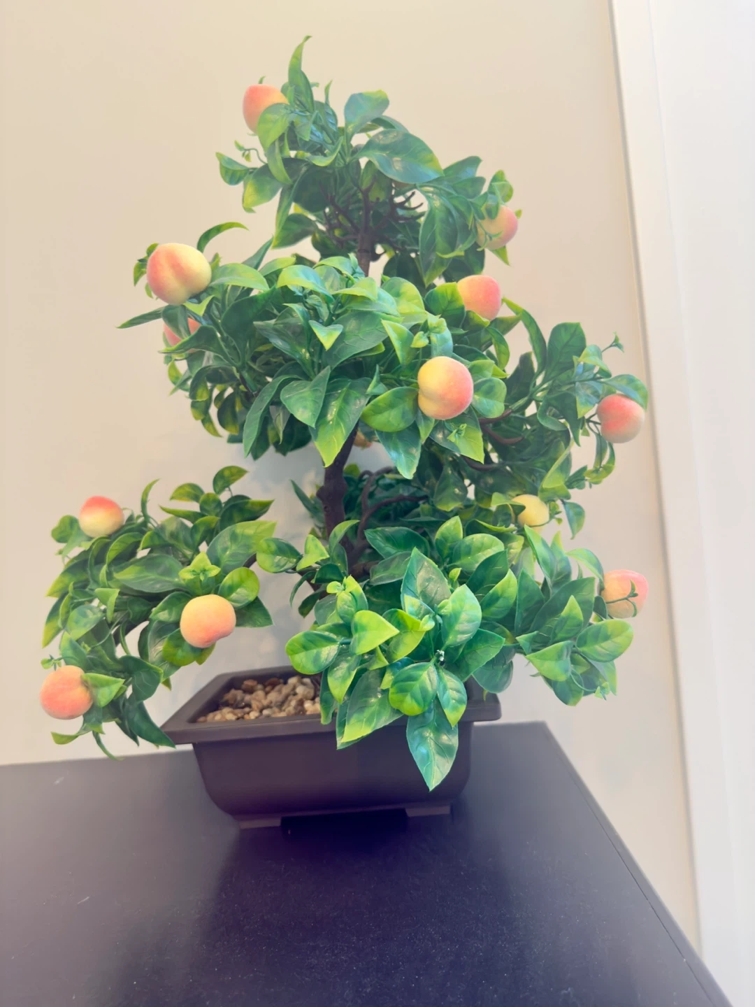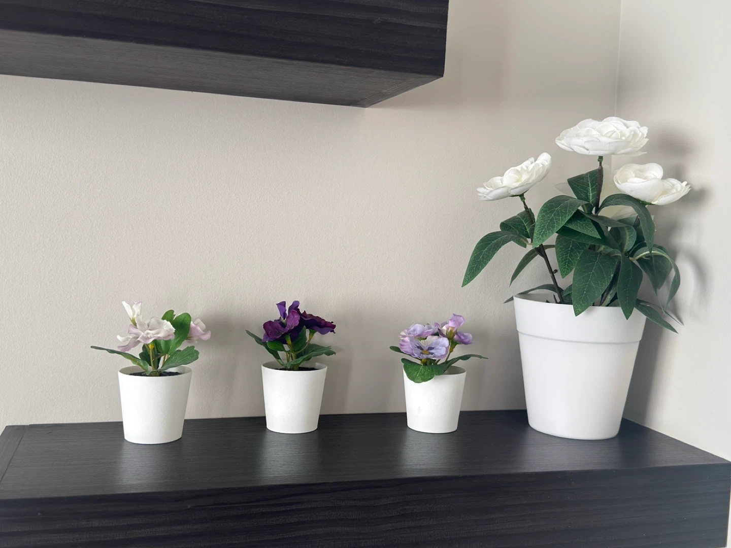 Collection of decorative artificial plants for home decor. Includes three small potted flowers, one larger potted white roses, and one green faux plant. Also features a faux orchid and a faux peach tree bonsai. All plants are in white or black pots.