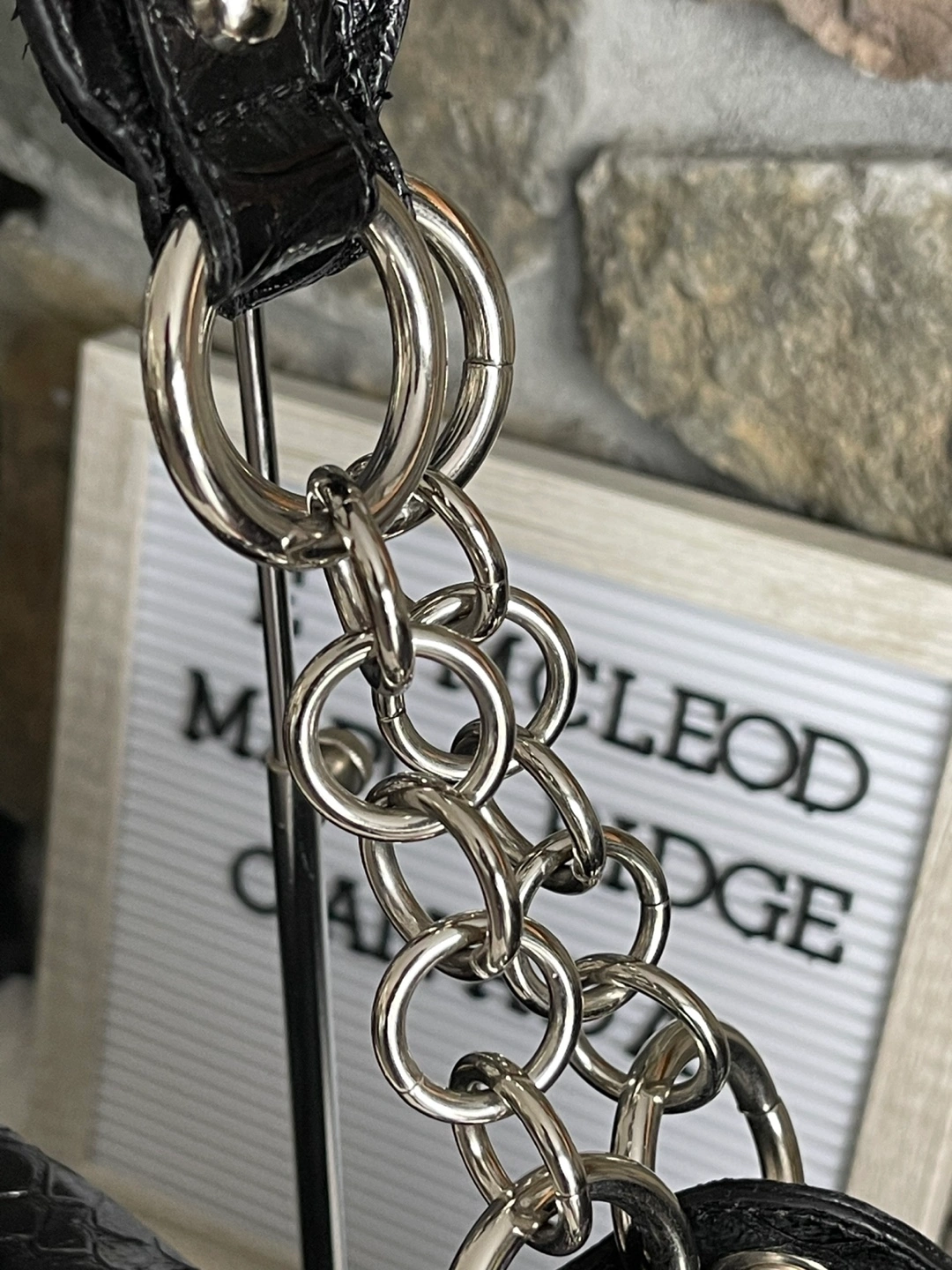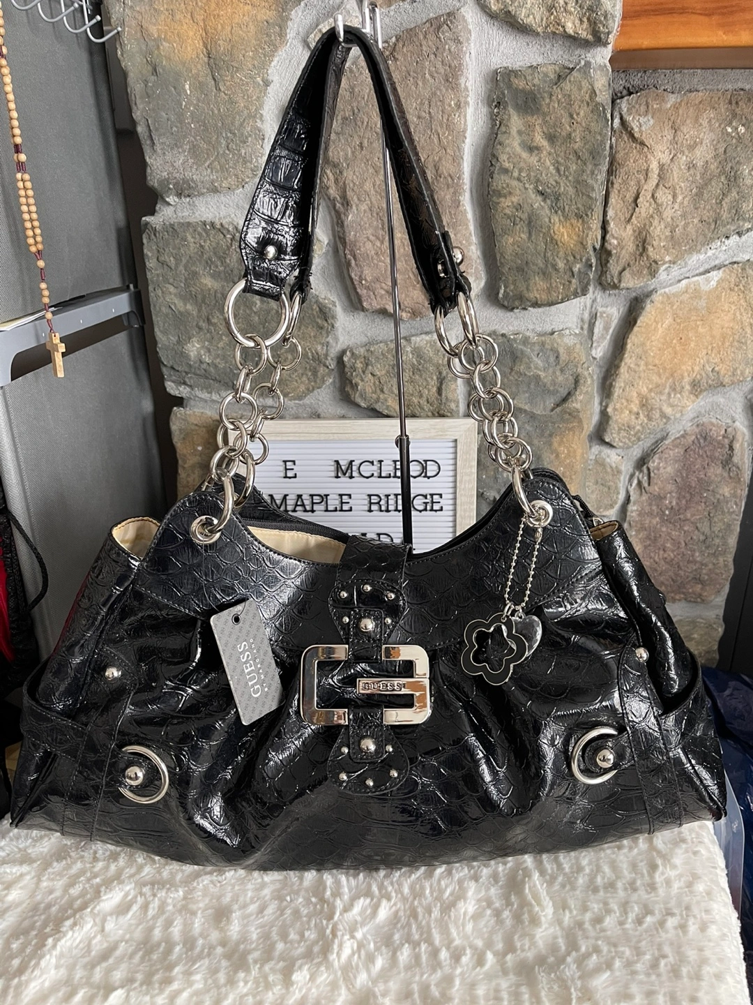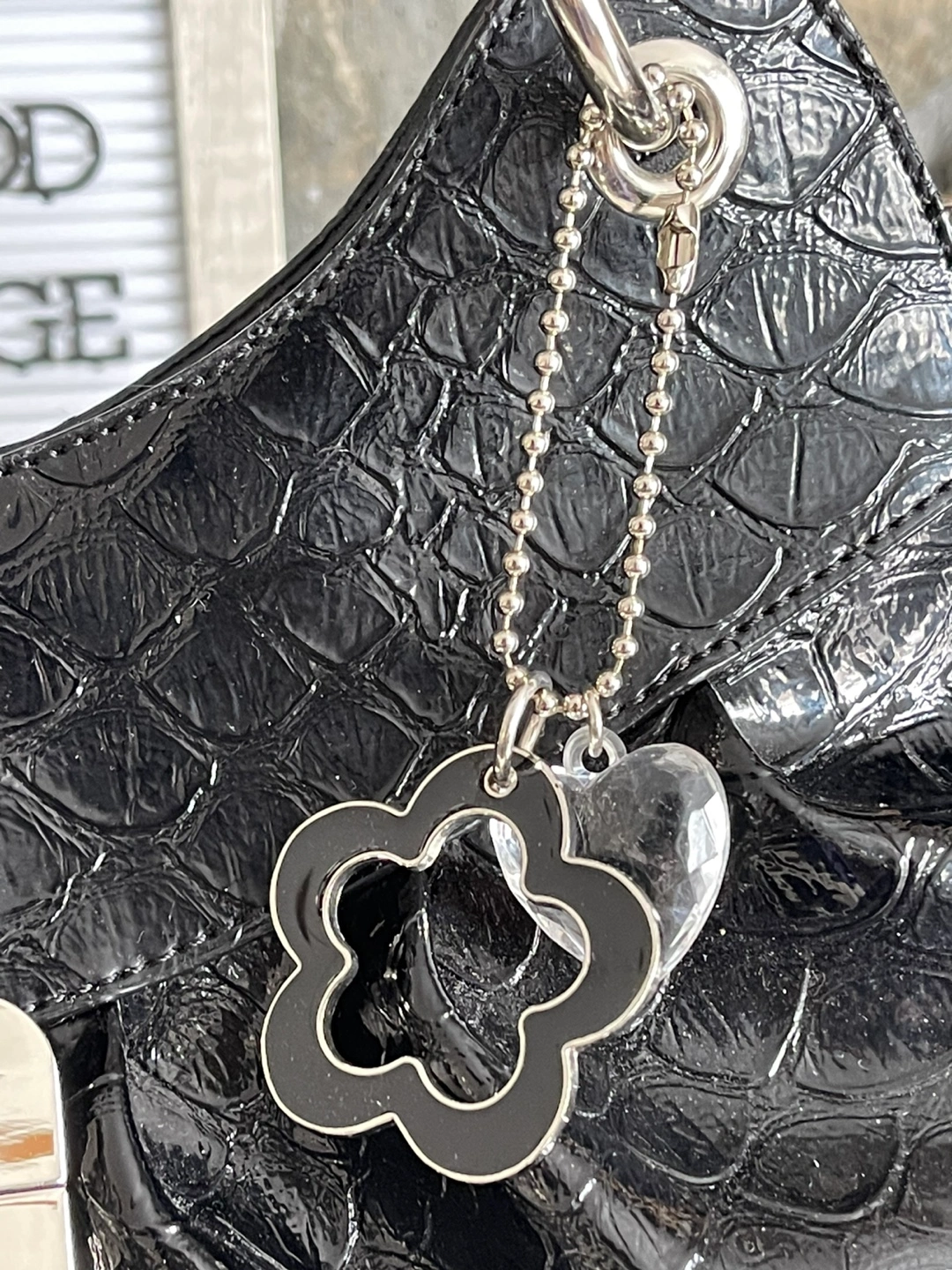 Black handbag, crocodile-embossed, silver hardware. Features a buckle closure and chain strap. Includes a flower-shaped charm. Brand new with tag . Pick up easy Maple Ridge