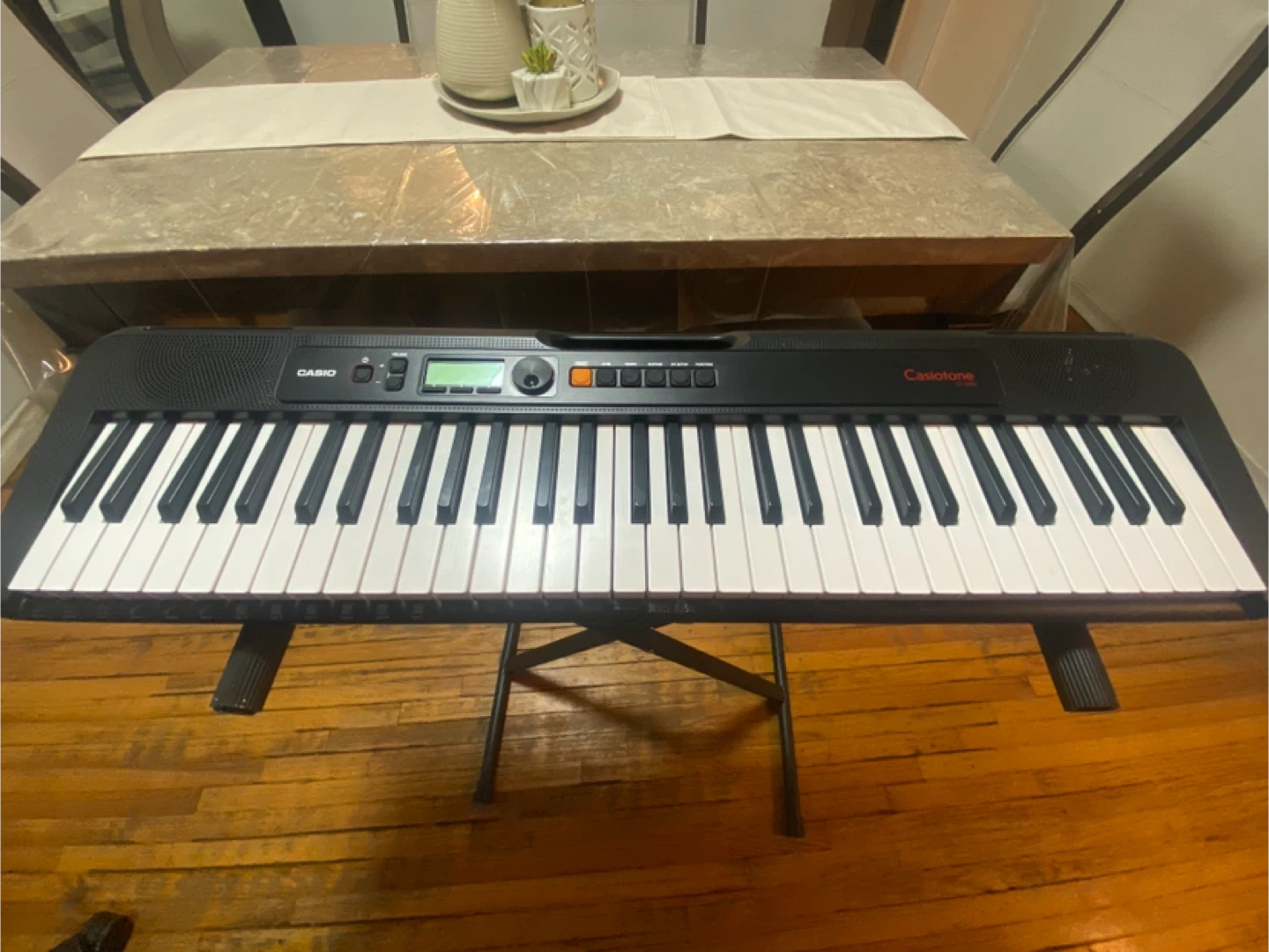 This is a Casio Casiotone keyboard with a black finish. It includes a keyboard stand for easy setup and playing. Perfect for beginners looking to learn piano.