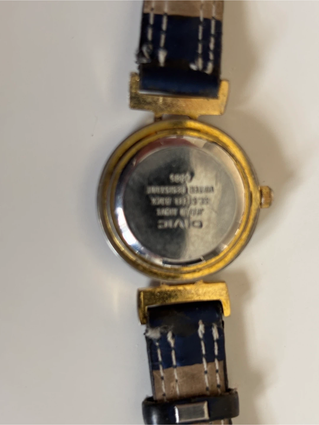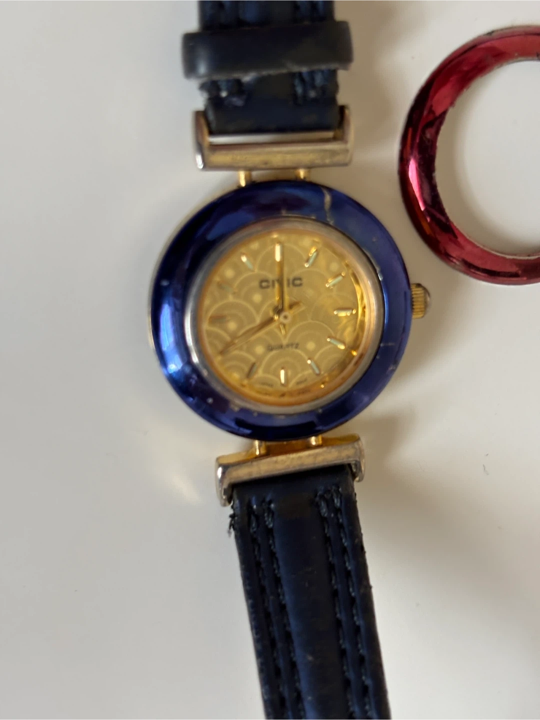 This CHIC quartz watch features a gold-tone dial and a blue bezel. It has a navy leather band and is water-resistant. A decorative red ring is also included.