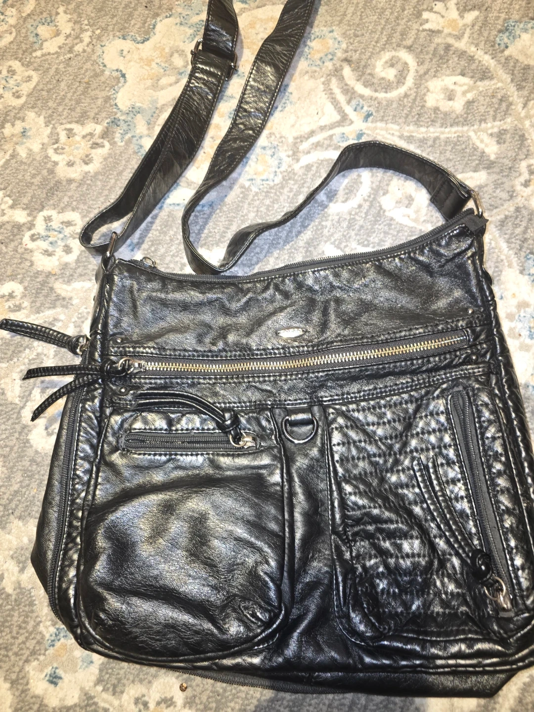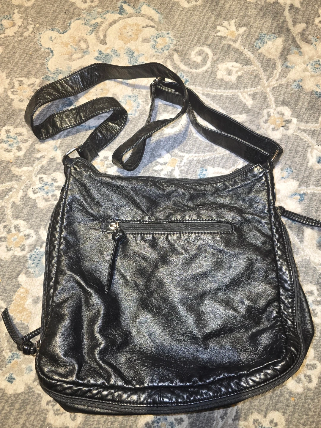 This black shoulder bag is made from faux leather. It features multiple zippered pockets for organization. The adjustable strap makes it comfortable to wear.