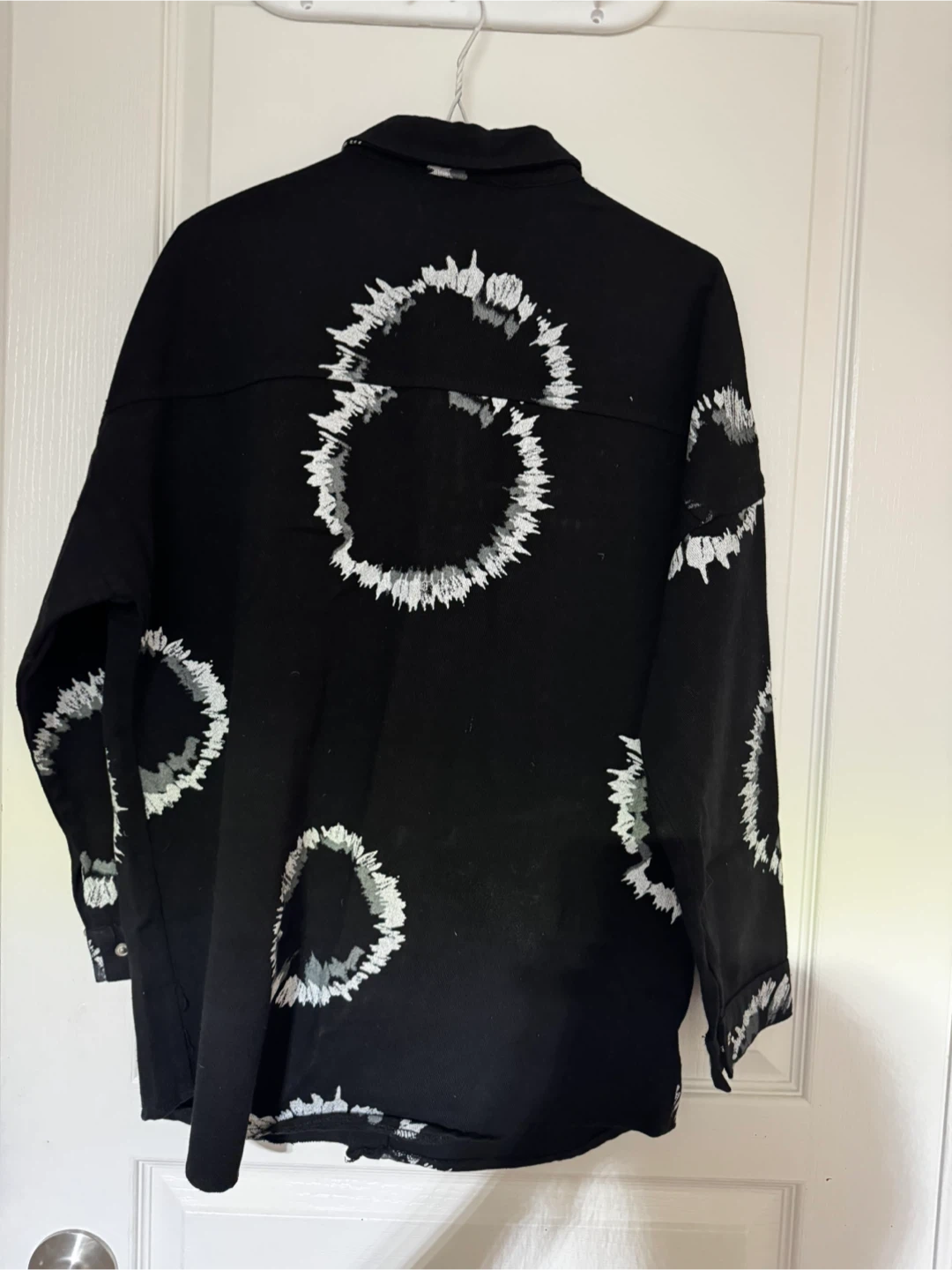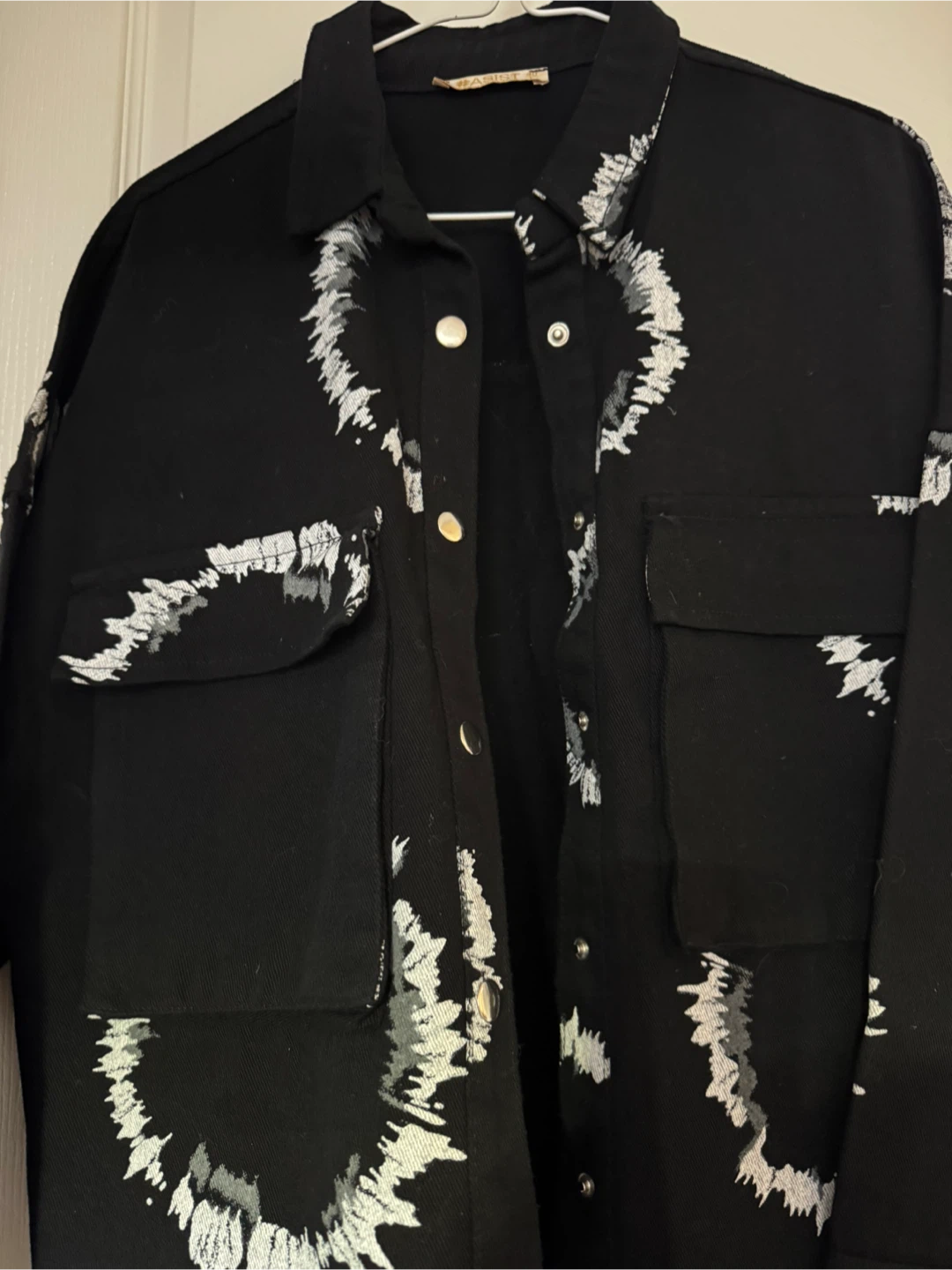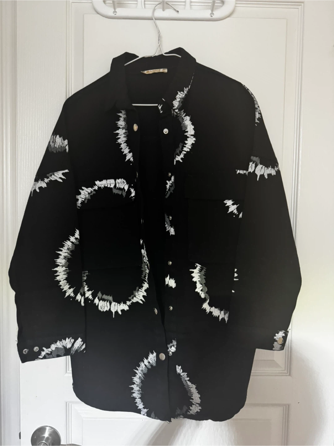 Selling a black button-down shirt. It features a unique pattern and is in great condition. It's perfect for adding a stylish touch to any outfit!