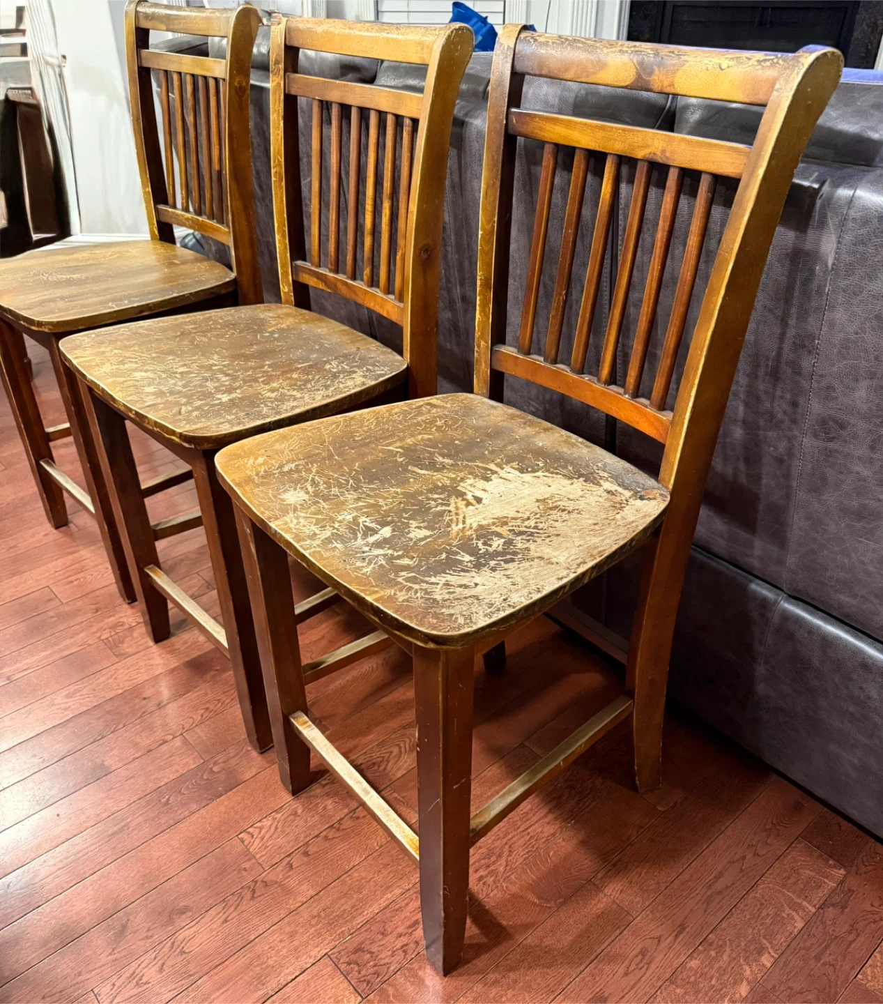 The seats have a beautiful natural wear and character that actually adds to the rustic/farmhouse vibe (easy to sand and refinish if you want them looking brand new)