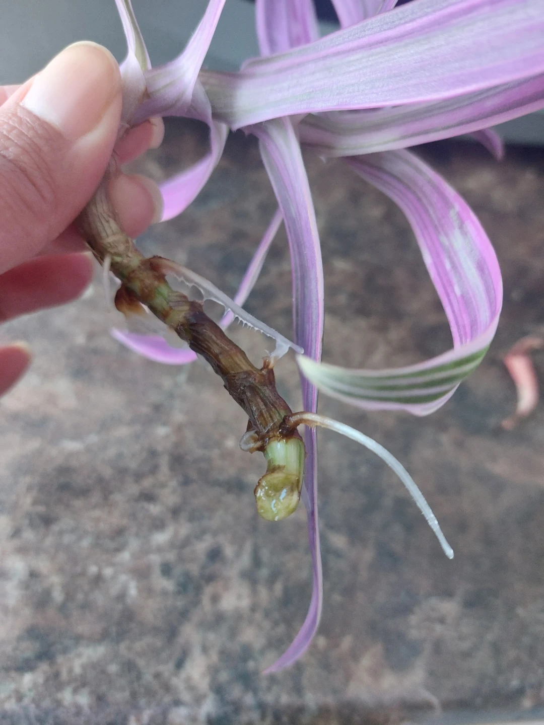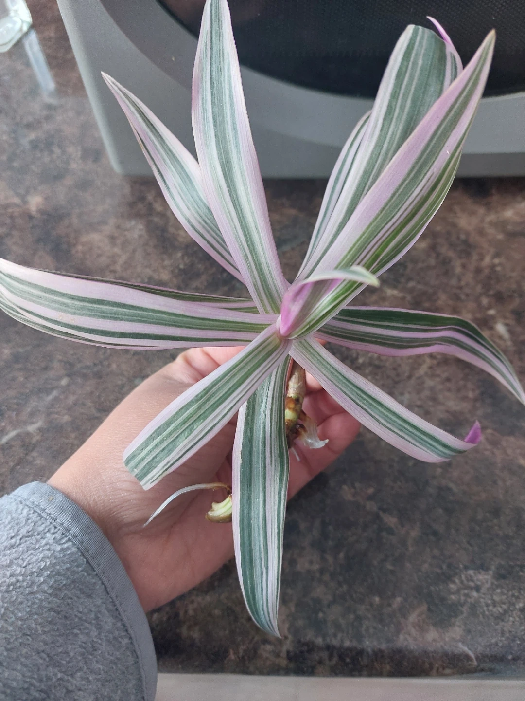 Tradescantia Rhoeo plant cutting with visible roots developing. This cutting features variegated leaves in shades of green and pink. Ready to be potted and grown!