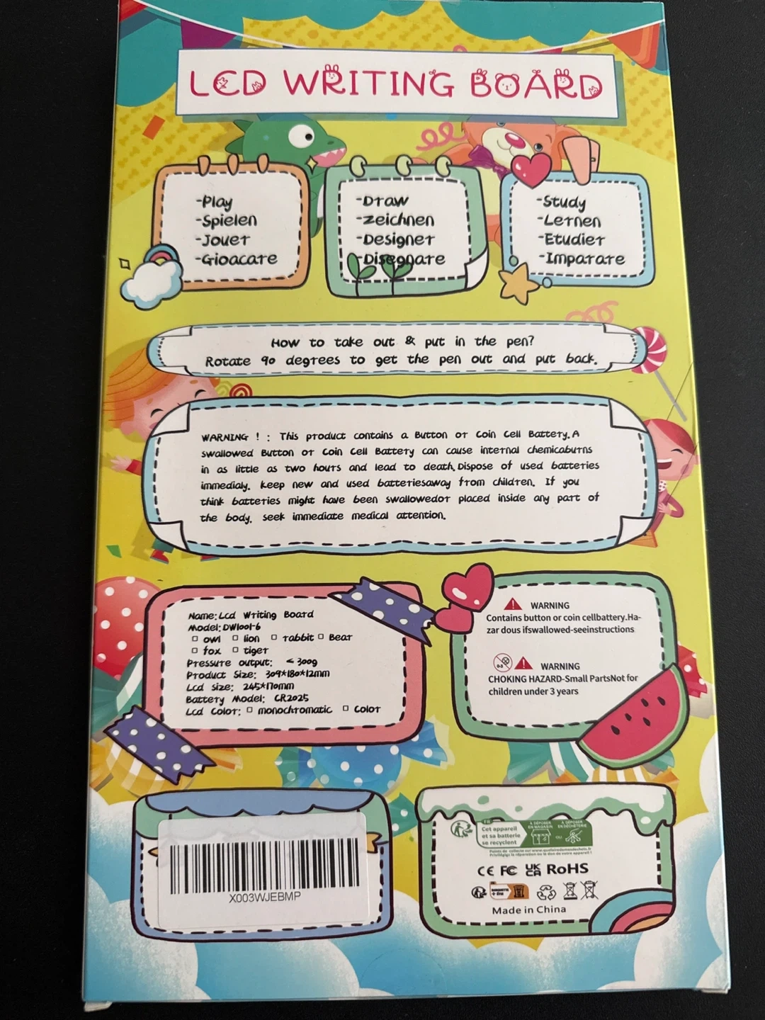 This is a fun LCD writing board for kids. It's perfect for drawing and practising letters. The board measures 8.5 inches diagonally. It's designed for children's use.