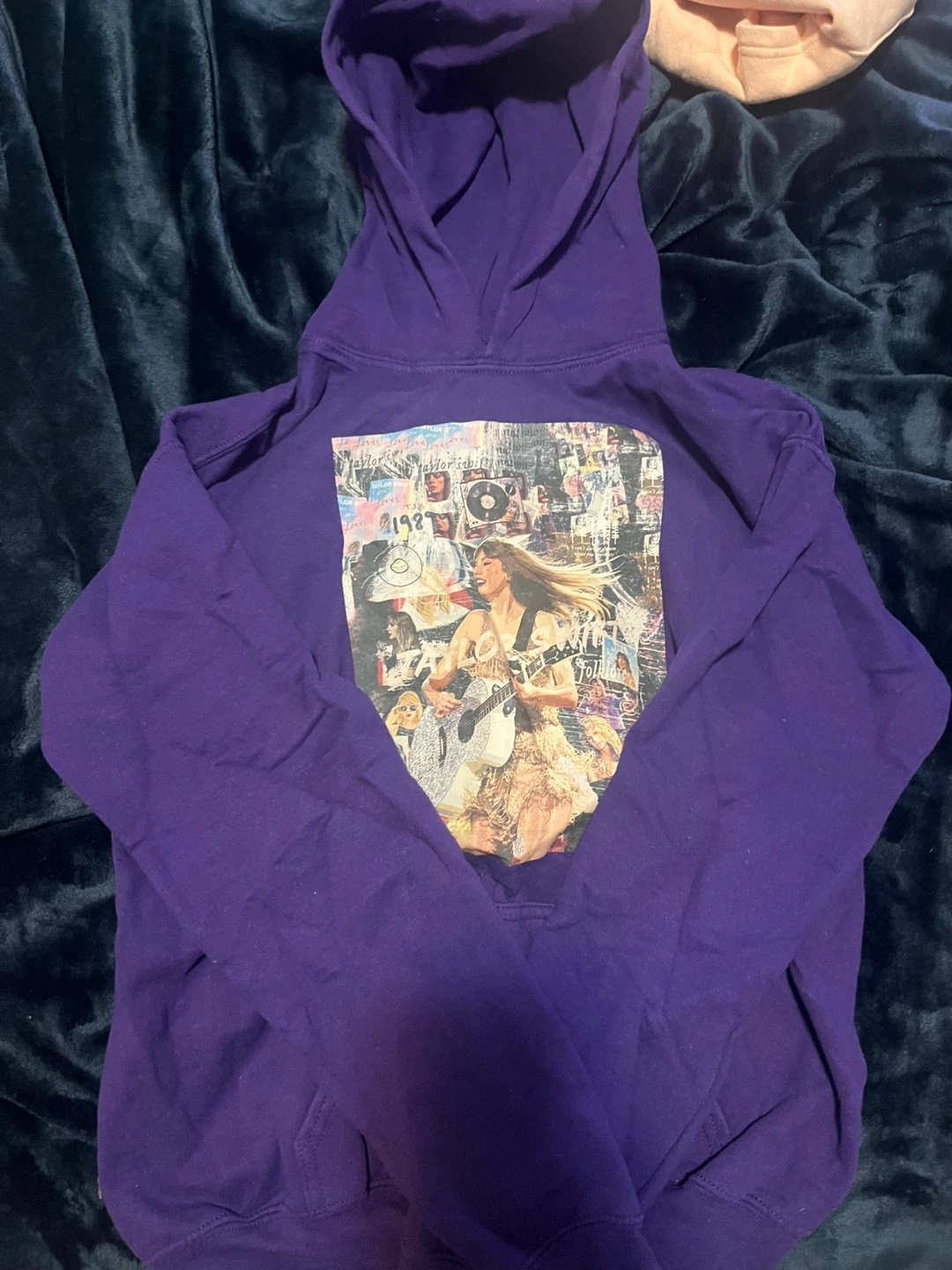 Selling a purple Taylor Swift hoodie! The hoodie features a collage-style print with images of Taylor Swift throughout her career. It's a great way to show your love for Taylor and her music