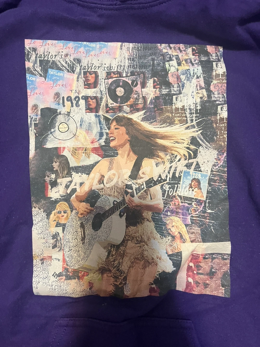 Selling a purple Taylor Swift hoodie! The hoodie features a collage-style print with images of Taylor Swift throughout her career. It's a great way to show your love for Taylor and her music