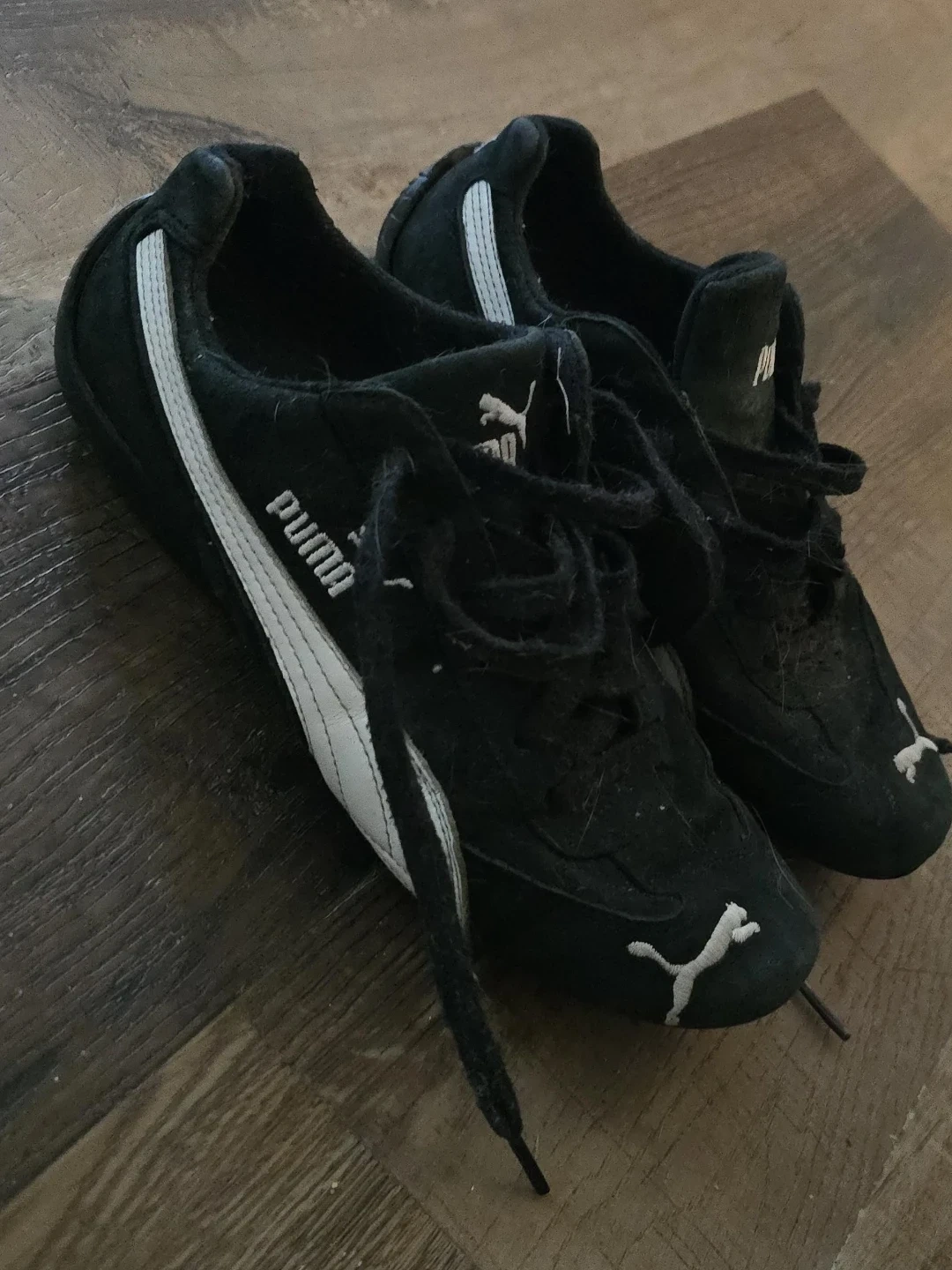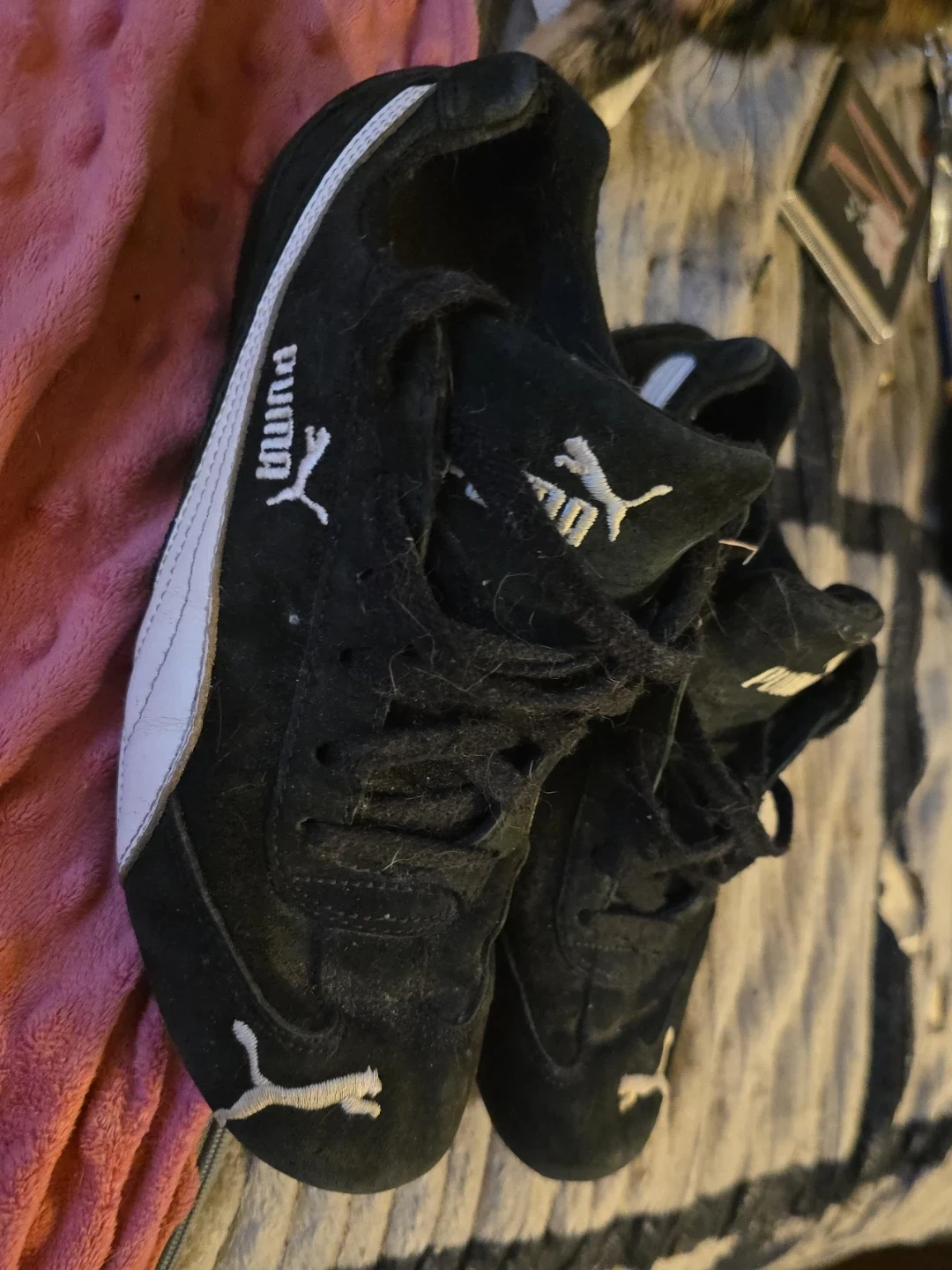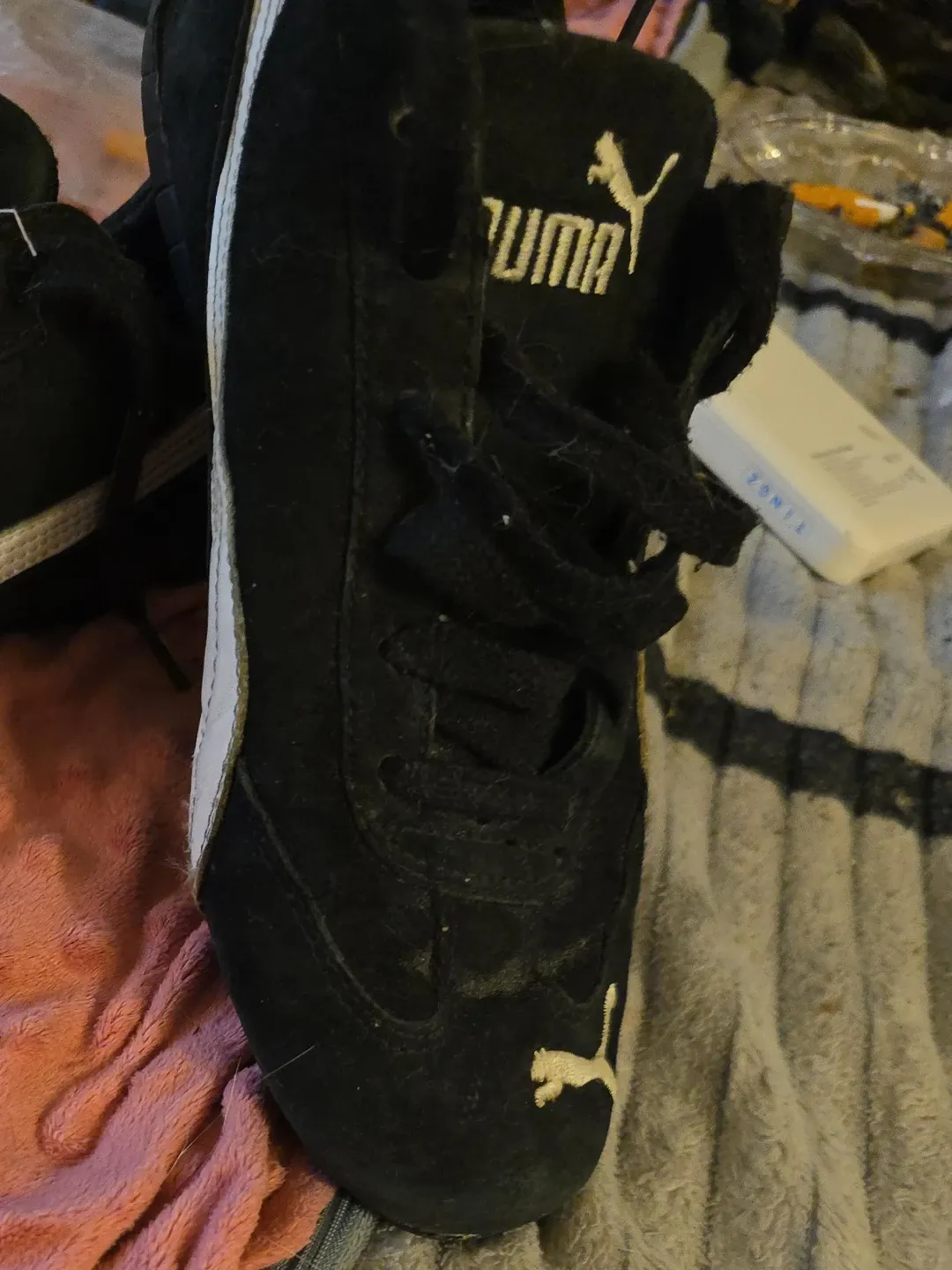 These are black Puma suede sneakers. They have white Puma branding and a white stripe on the side. Laces are black. Suede material.