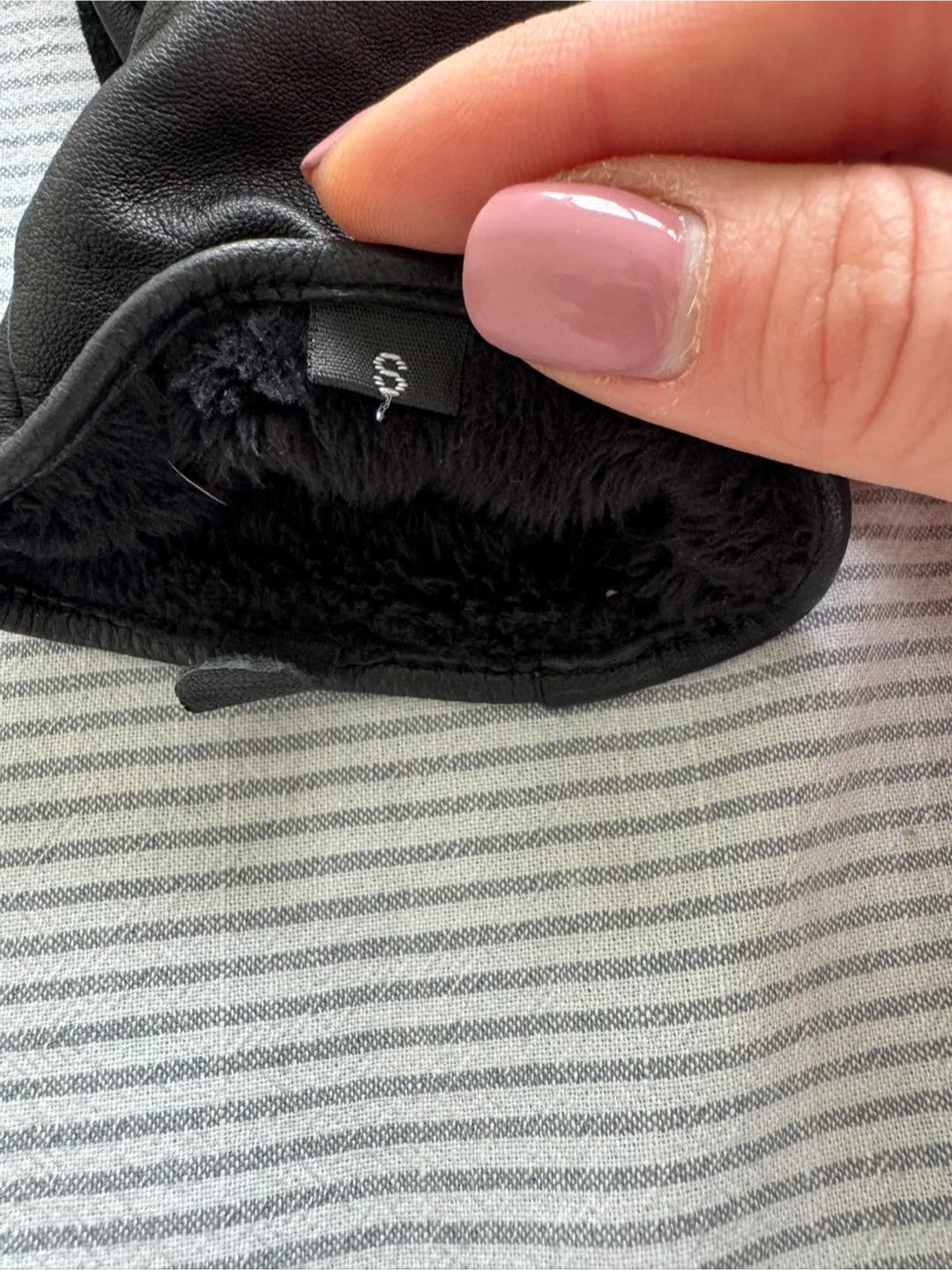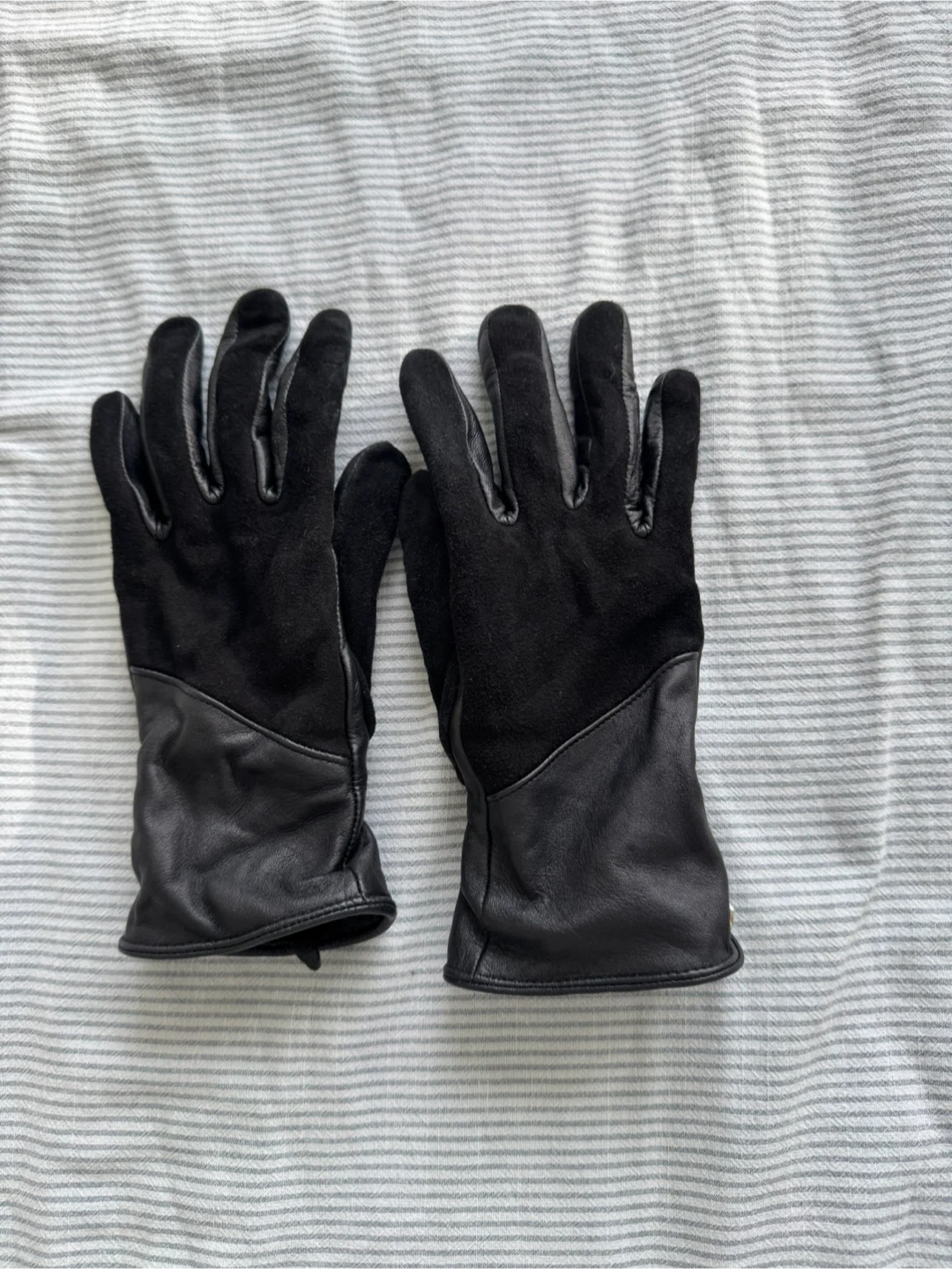Black leather and suede gloves with a soft lining. Features a size S tag inside. Great for keeping your hands warm in the colder months!
