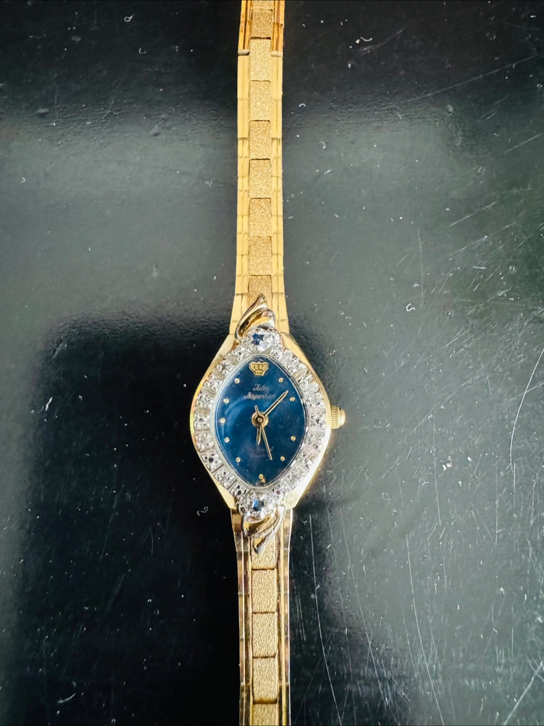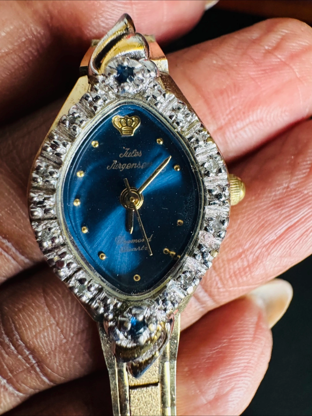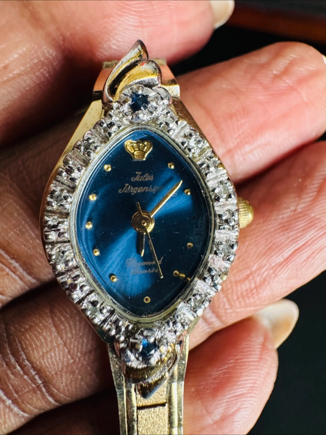 DIAMOND DUST - One is a Julius Jurgensen watch with a gold-tone band and a blue face surrounded by crystals. The other is a gold-tone watch with a rectangular face