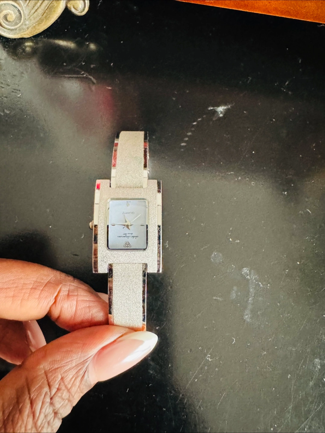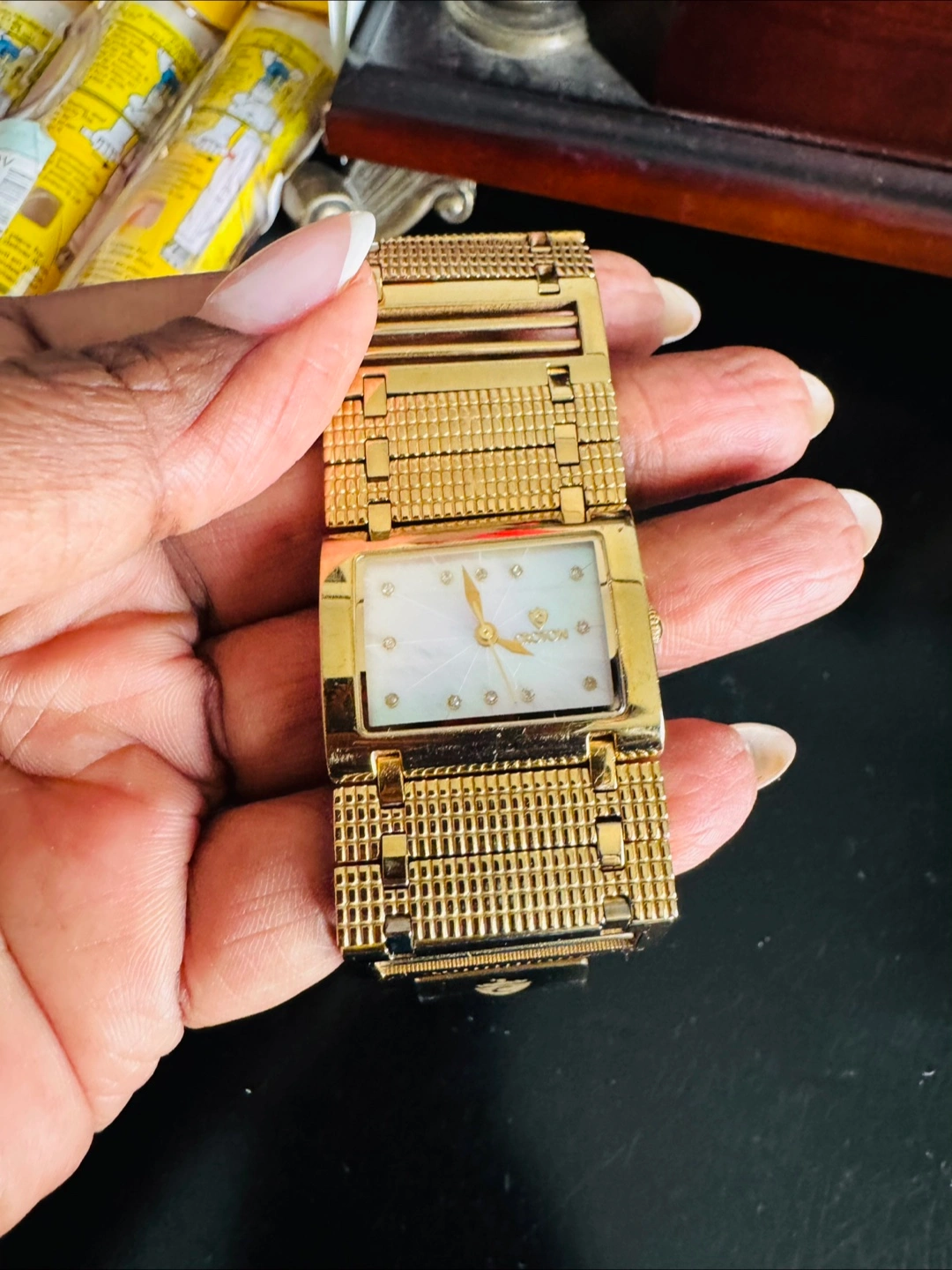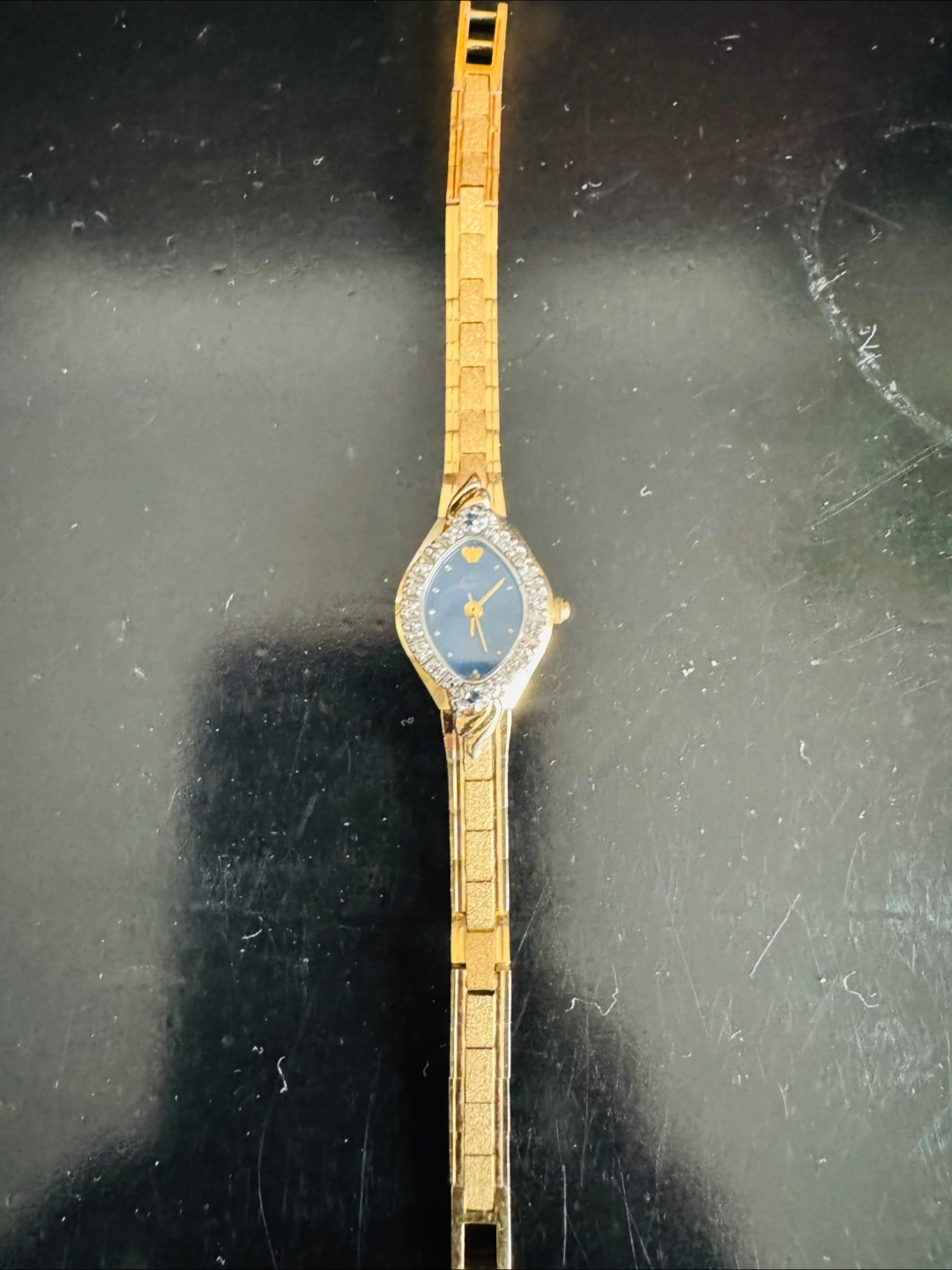 DIAMOND DUST - One is a Julius Jurgensen watch with a gold-tone band and a blue face surrounded by crystals. The other is a gold-tone watch with a rectangular face