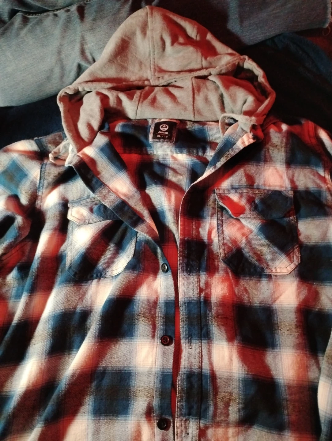 Cozy Ambig flannel hoodie, perfect for layering! It's an XL size and features a classic blue and white plaid pattern. The hood is a soft grey material. In great condition!