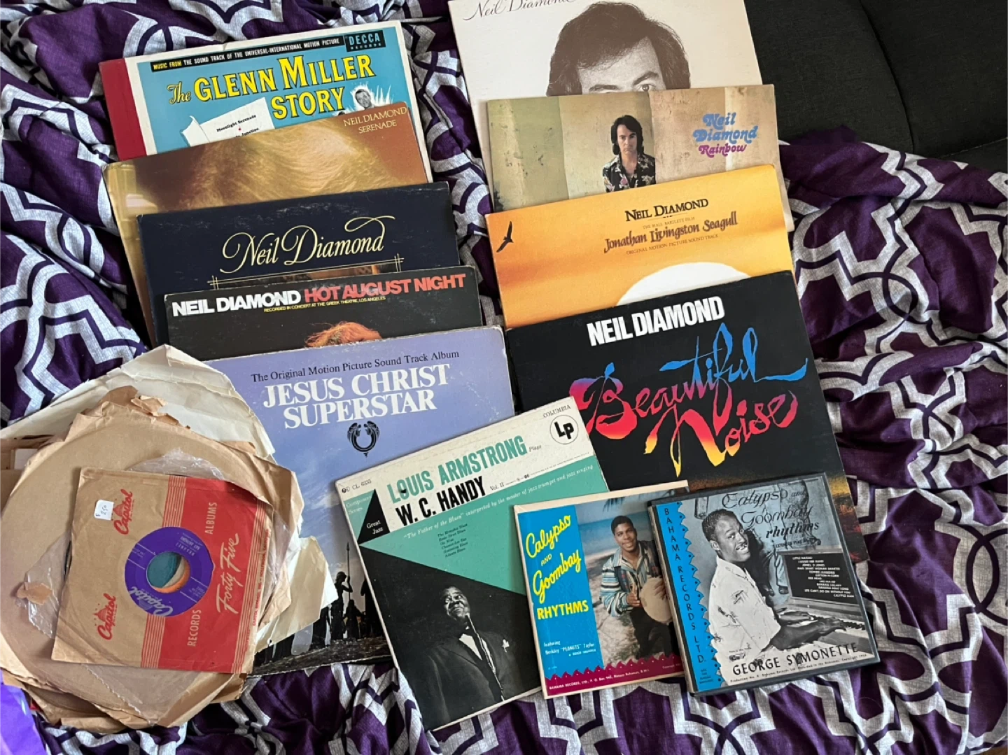 This is a collection of vintage vinyl records featuring a variety of artists including Neil Diamond, Louis Armstrong, and The Glenn Miller Story soundtrack. It also includes a Jesus Christ Superstar Original Motion Picture Sound Track album. Records come in sleeves and some are in their original jackets.