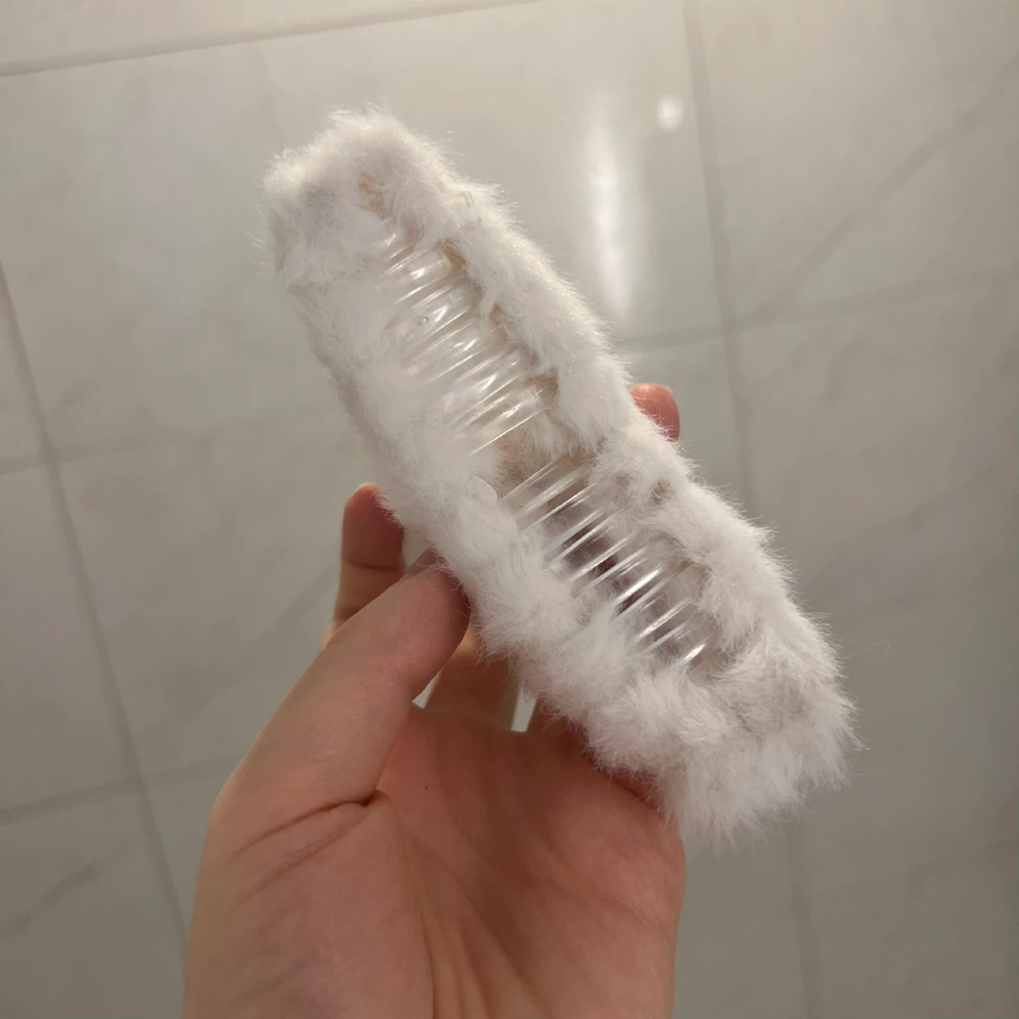 A cute white fuzzy claw clip for your hair. It's made of a soft material and has a secure grip.