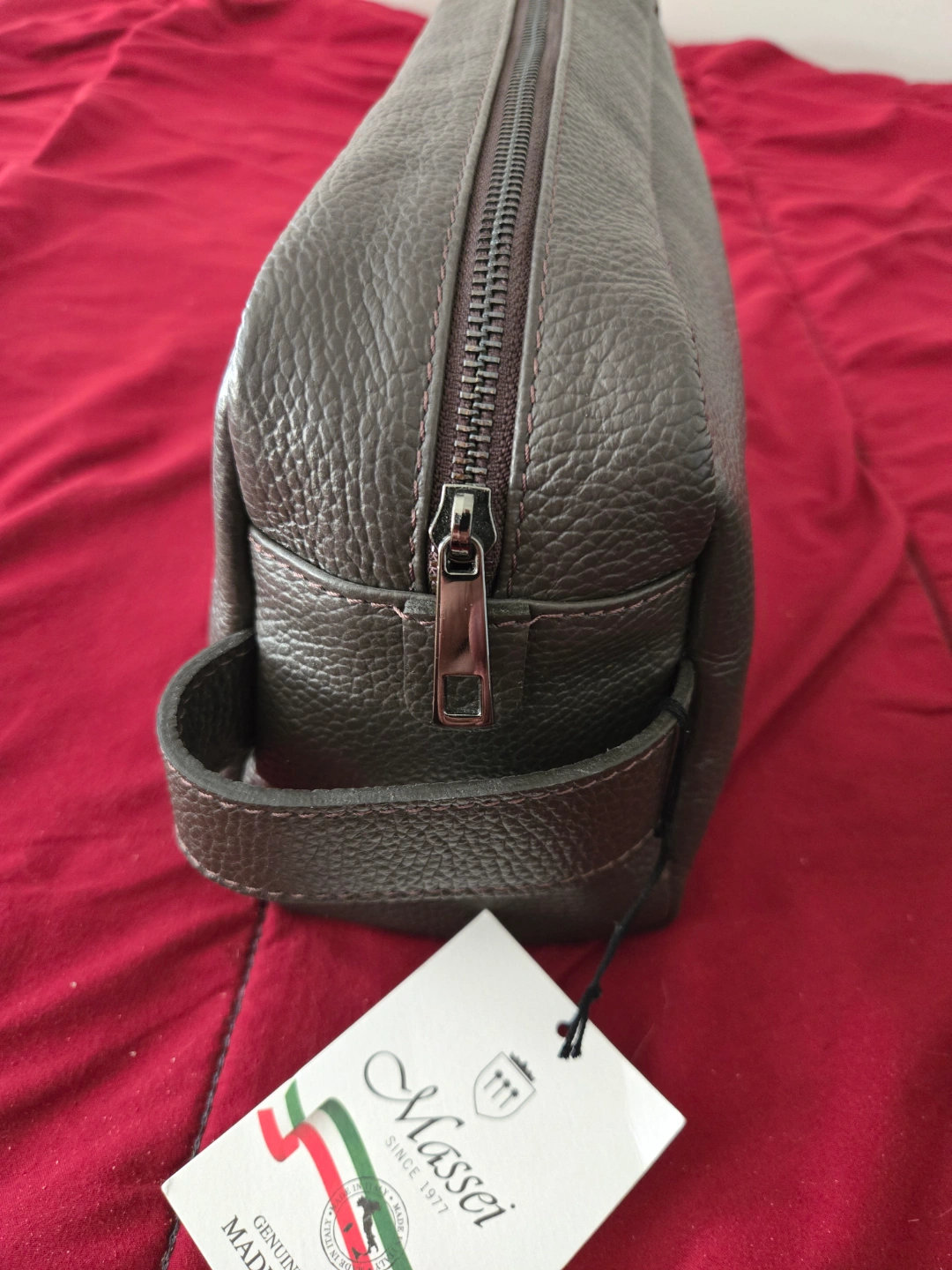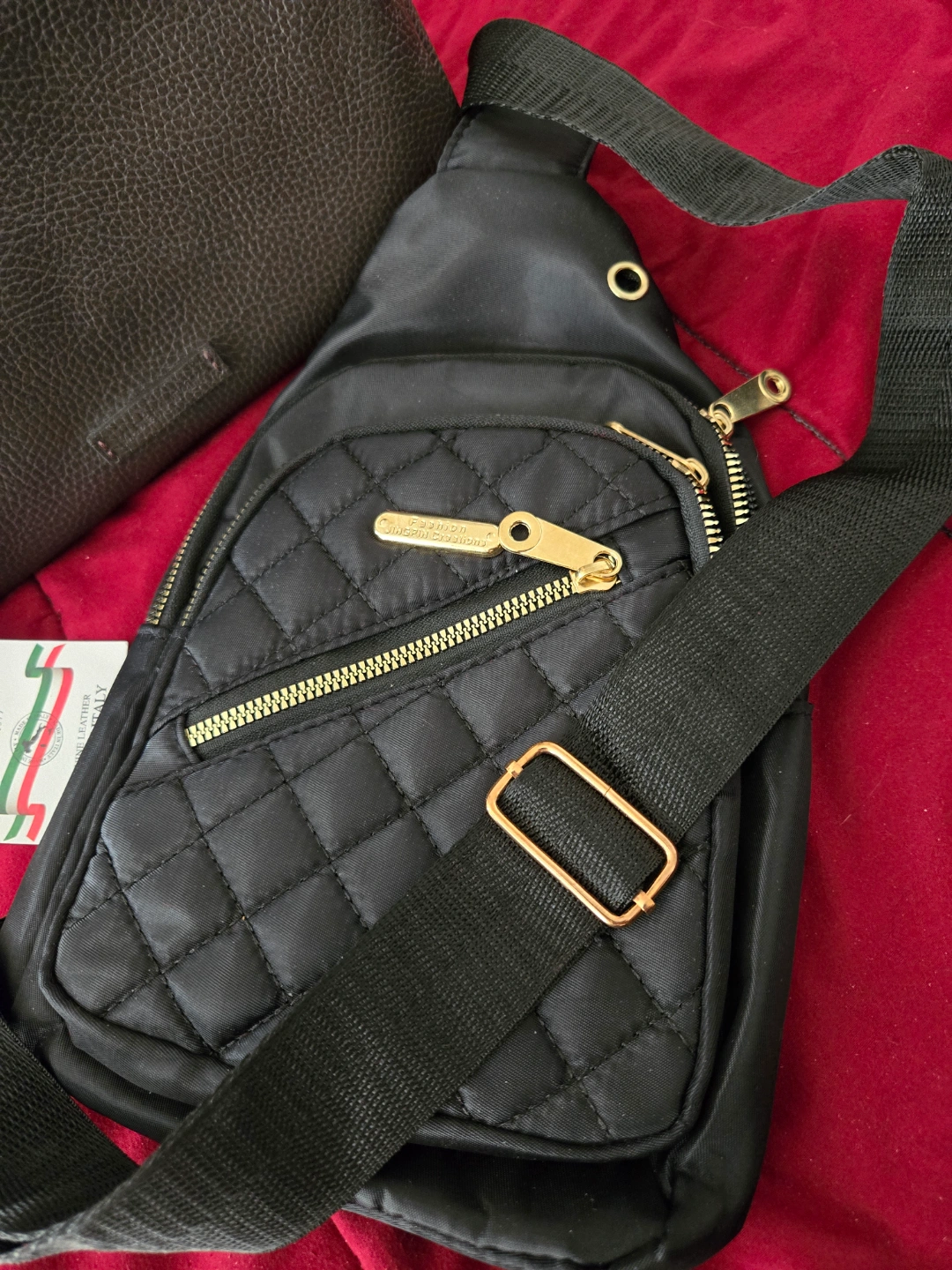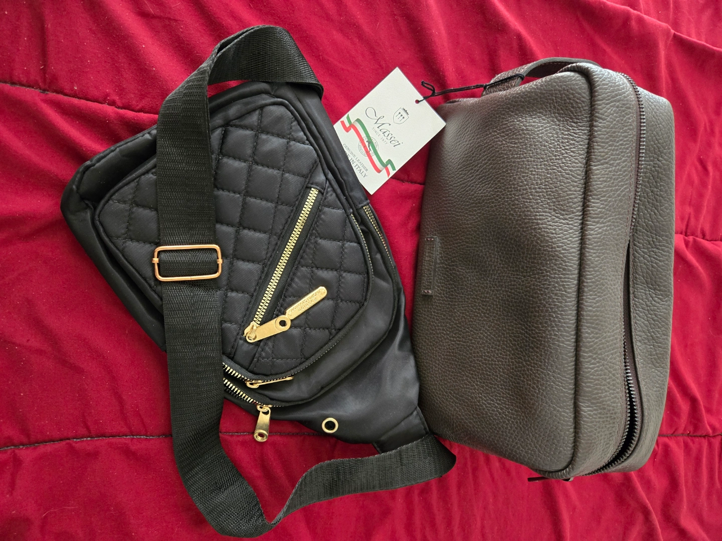 New Black shoulder bag with a quilted design. Gold-toned zippers. Massei brown Italian leather travel bag. Use them for any travel experience