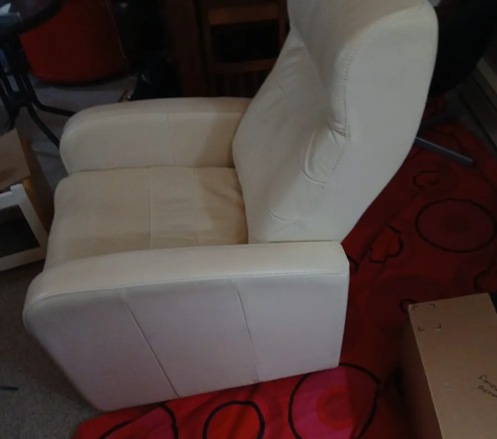 Creamy white accent chair. Leather upholstery. It's a comfortable and stylish addition to any room. ELECTRIC RECLINER. PICK UP ONLY. 150 OBO