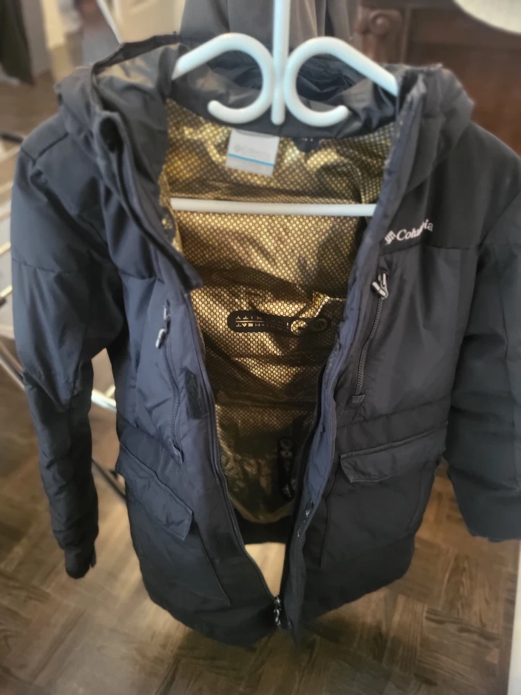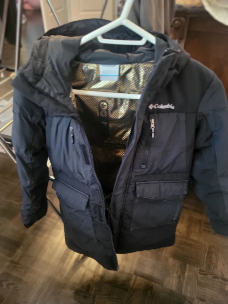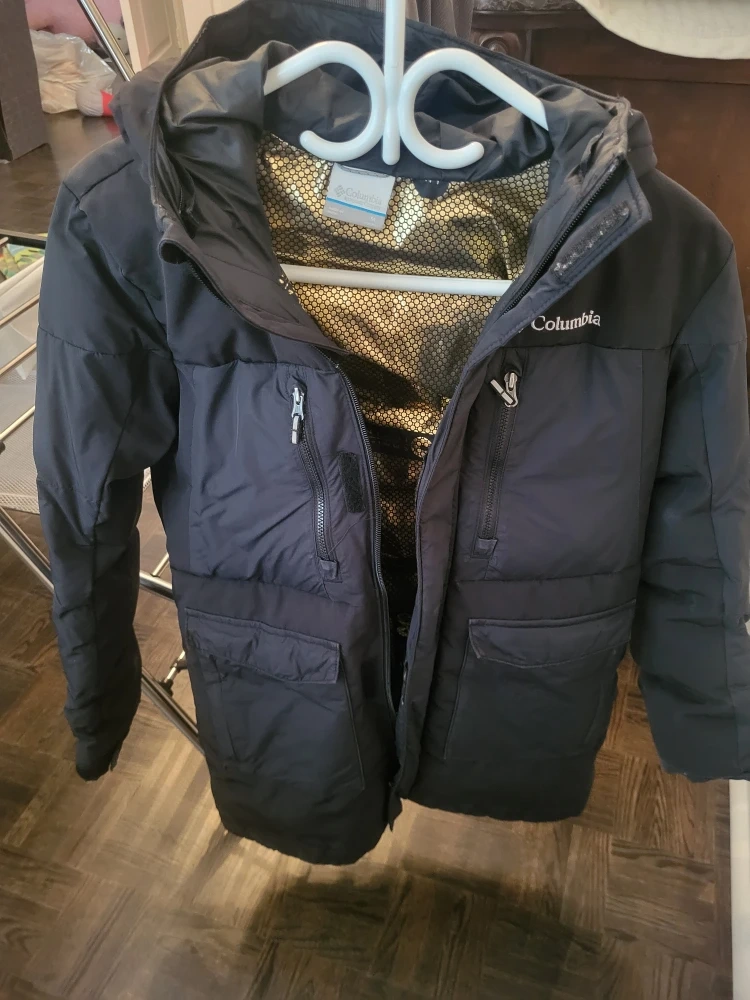 Columbia black winter jacket for kids. It's insulated and features a hood for extra warmth. Perfect for staying cozy during colder months! One size small and one size medium