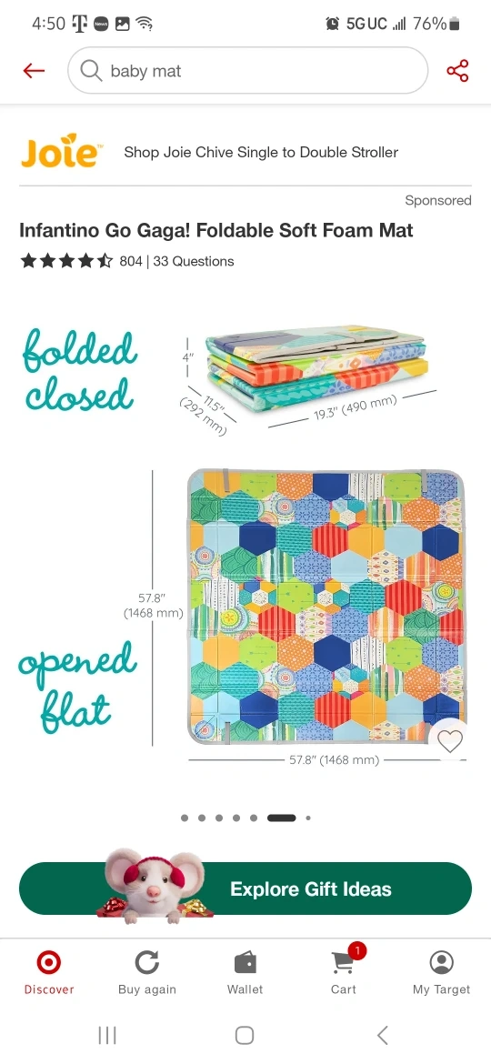 Foldable Soft Foam Mat. It features a double-sided print and a compact, light fold & go design. It also includes a vinyl storage bag! When opened flat, it measures 57.8" x 57.8" (1468 mm x 1468 mm). It's easy to wipe clean and has a reversible design. has 1 small tear on the colorful side but still can be used.
