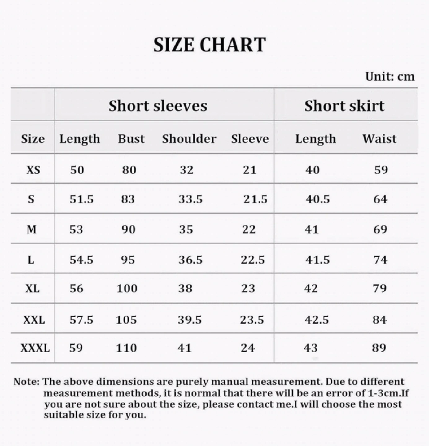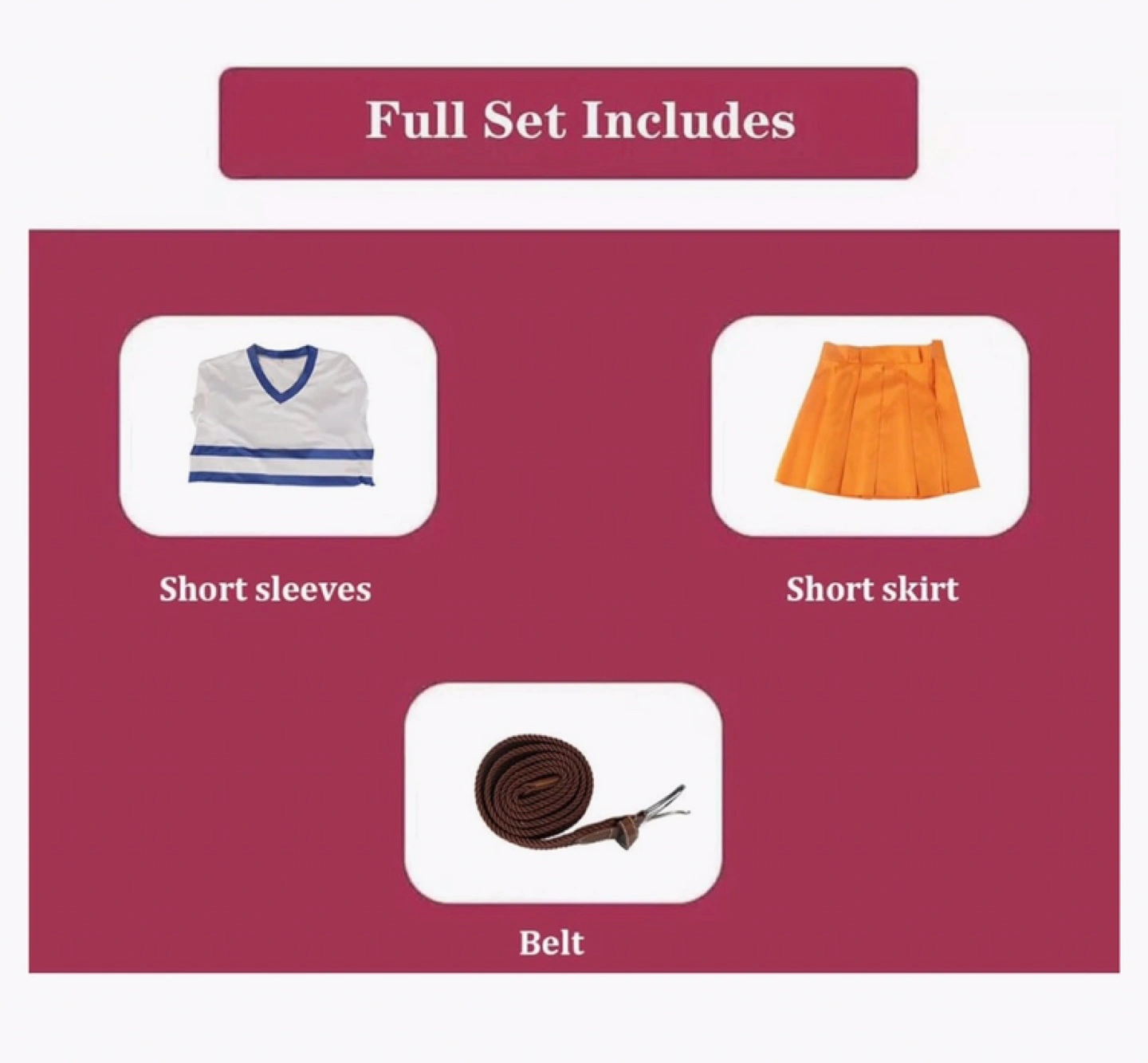 Full set includes short sleeves, short skirt, and belt. Size chart in image.