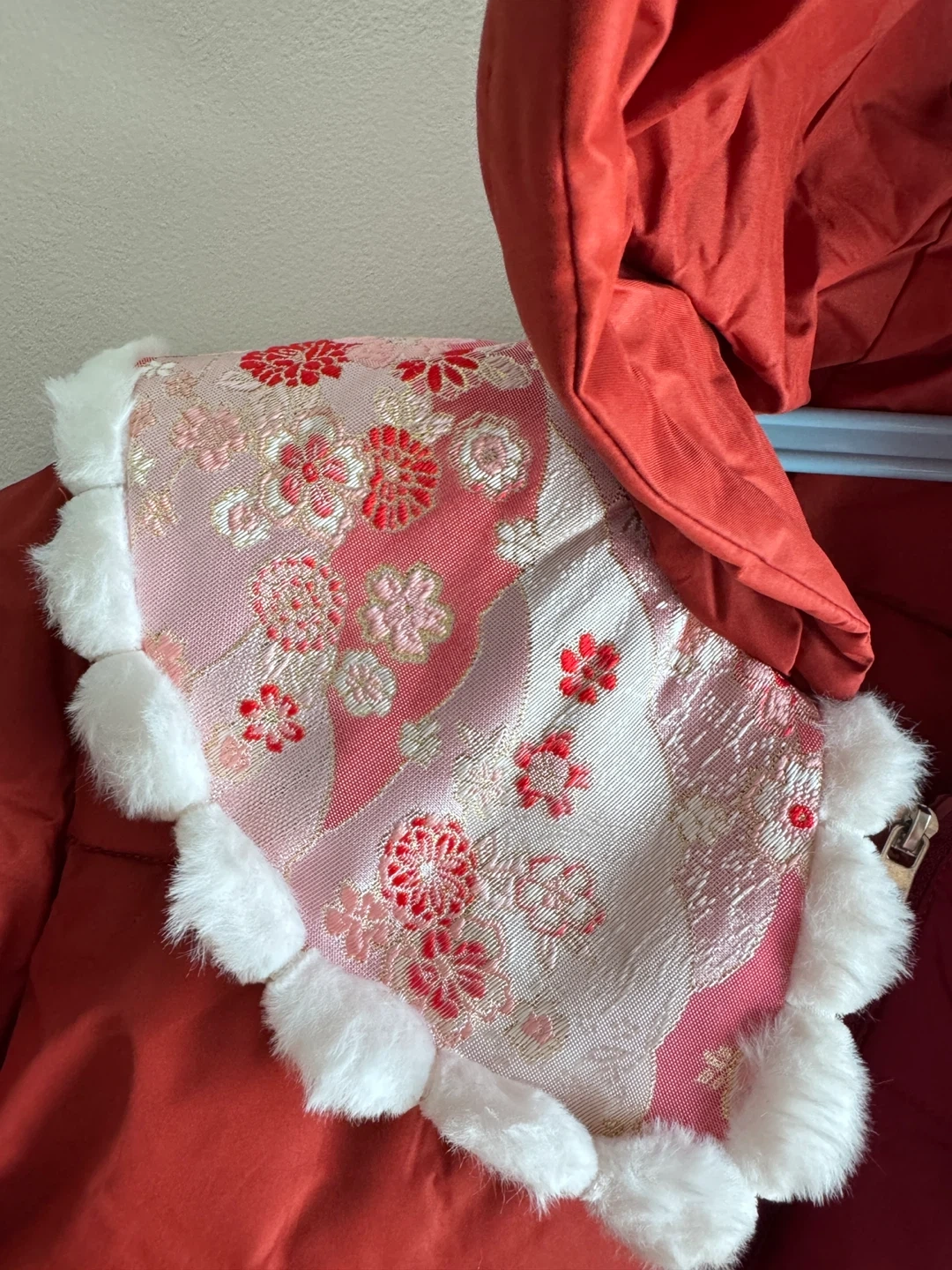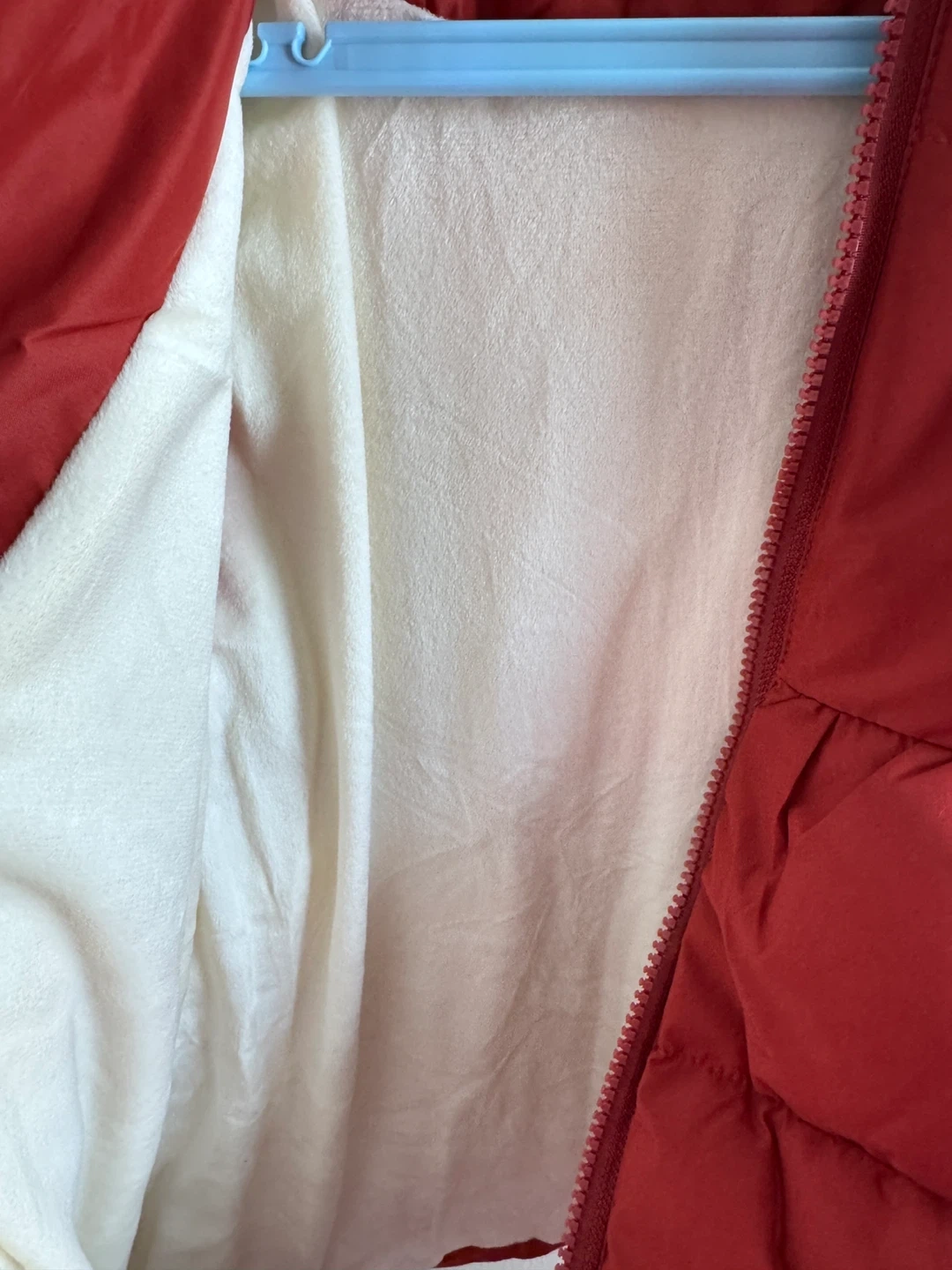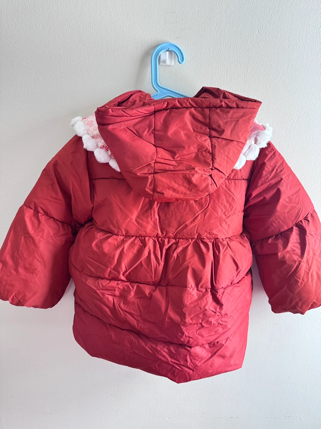 Keep your little one warm this winter with this adorable red padded coat! It features a unique floral collar with soft, fluffy trim, adding a touch of charm to the classic puffer style. The coat is in great condition and ready for a new home.