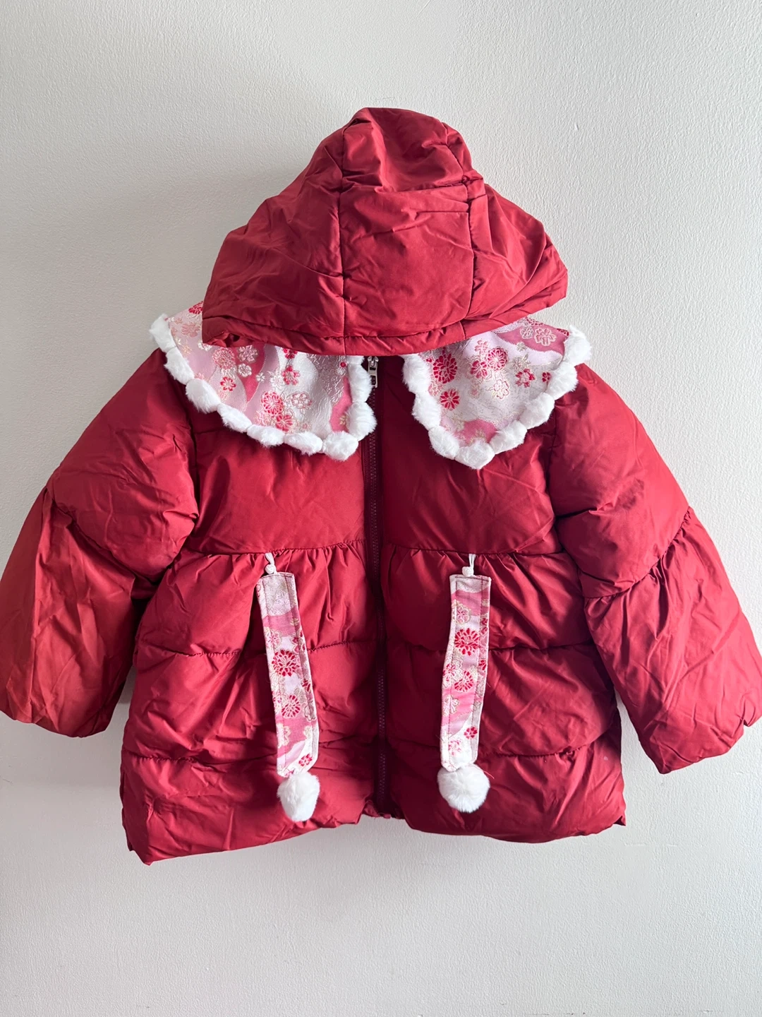 Red Padded Winter Coat with Floral Collar Toddler size 6-7at