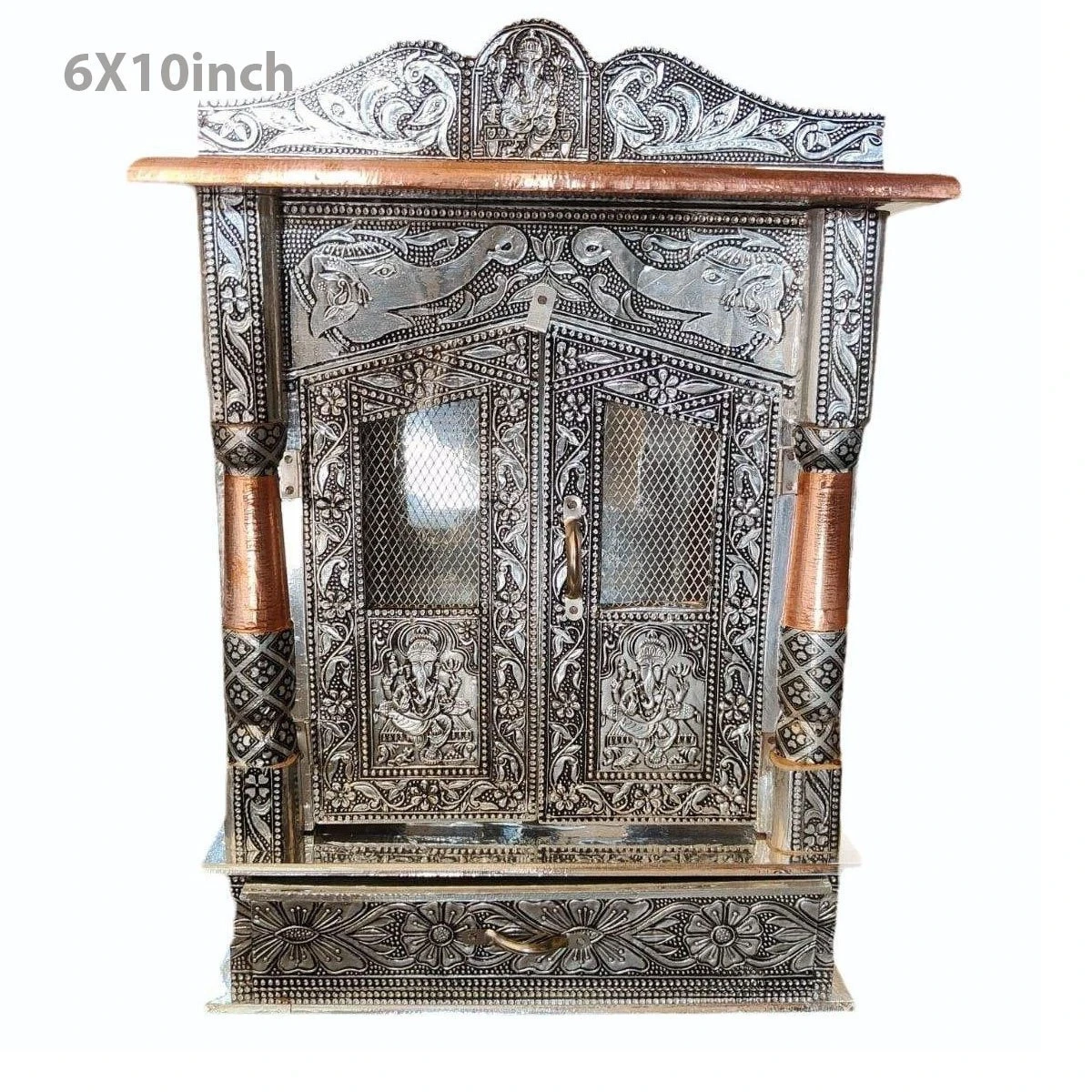 This is a beautiful, handcrafted Pooja Mandir, perfect for your home. It measures 6x10 inches and features intricate silver detailing with copper accents. It has a drawer at the bottom for storage.